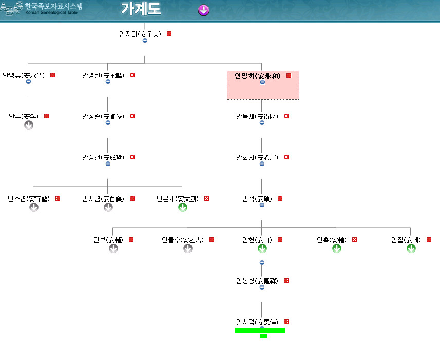 안자미(安子美) - 안영화(安永和) - 안득재(安得財) - 안희서(安希諝) - 안석(安碩) - 안헌(安軒) - 안봉상(安鳯祥) - 안사검(安思儉)으로 계통이 이어지는 순흥안씨 3파로 8세가 되는 안사검(安思儉)으로 추정된다.