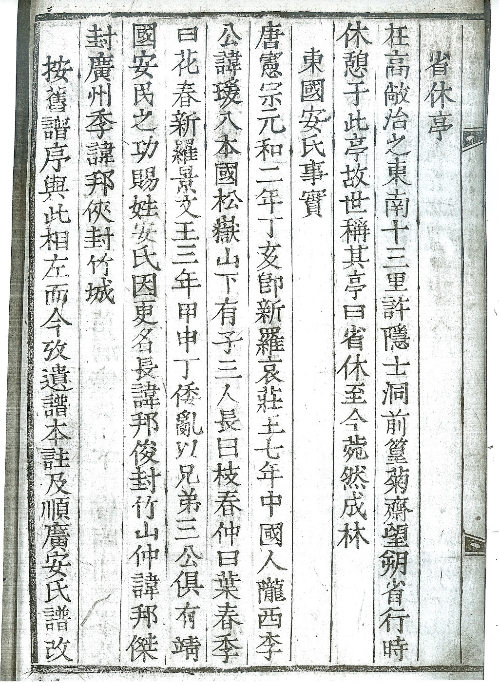 初諱枝春 隴西李公諱瑗第一子 新羅景文王甲申倭亂 靖國安民之功 賜姓安氏 因改仐諱 封竹山君 憲康王四年卒 壽七十二 〇郡夫人金氏父光玉 墓開城府鵠嶺下乾坐 초휘는 지춘(枝春)으로 농서(隴西) 이원(李瑗) 공의 첫째 아들이다. 신라 경문왕(景文王) 갑신왜란(甲申倭亂)에 나라를 안정시키고 백성들을 편안하게 한 공[靖國安民之功]으로 안씨(安氏)를 사성(賜姓) 받고 이름까지 고쳐 죽산군(竹山君)에 봉해졌다. 헌강왕(憲康王) 4년(878)에 졸해서 72세의 수를 살았다. 〇군부인 김씨(金氏)는 김광옥(金光玉)의 따님이다. 묘는 개성부 곡령(鵠嶺) 아래 건좌(乾坐, 서북쪽을 등진 자리)에 있다. | |