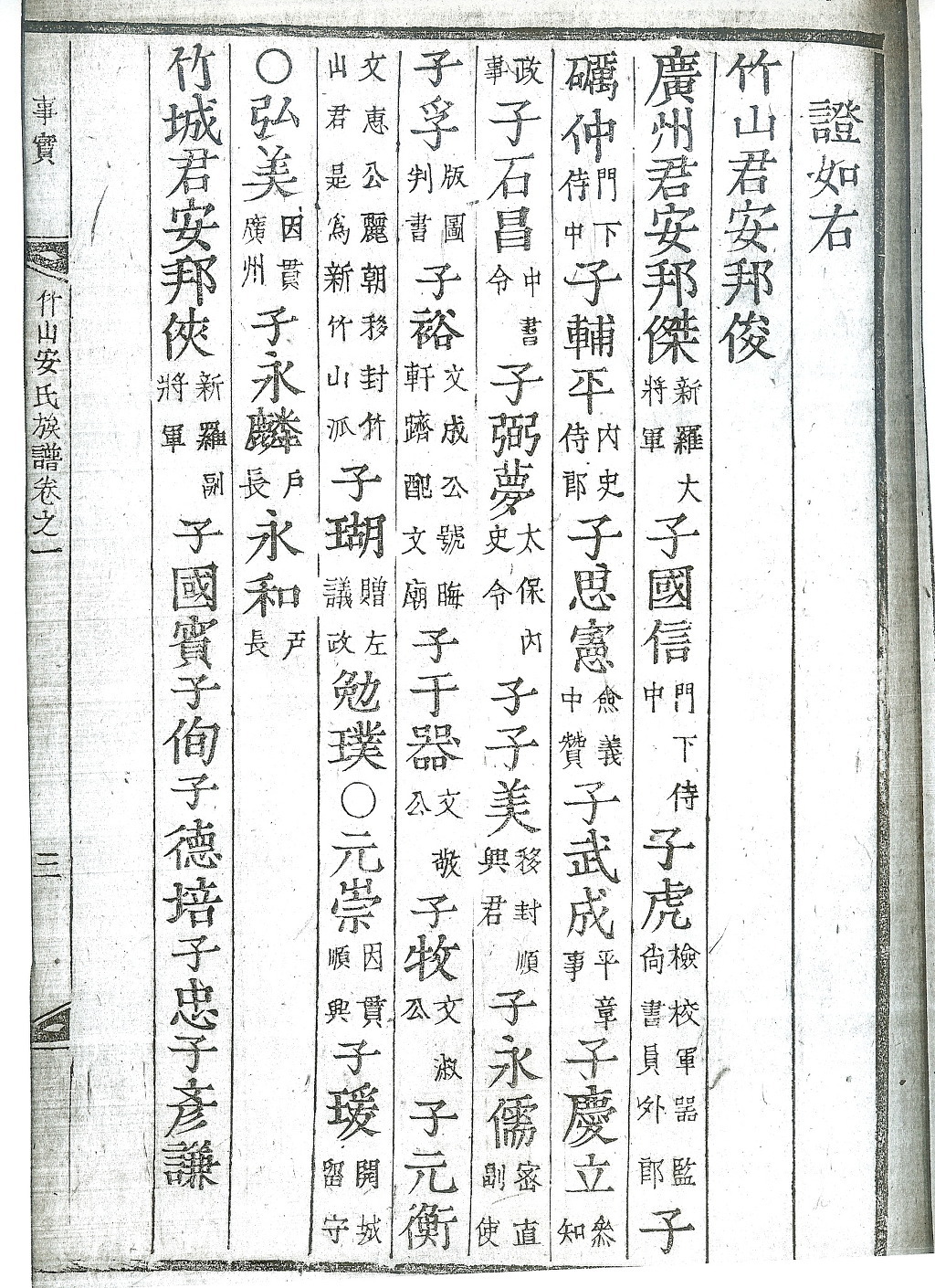 竹城君 安邦俠(新羅副將君) - 子 國賓 - 子 侚 - 子 德培 - 子 忠 - 子 彦謙