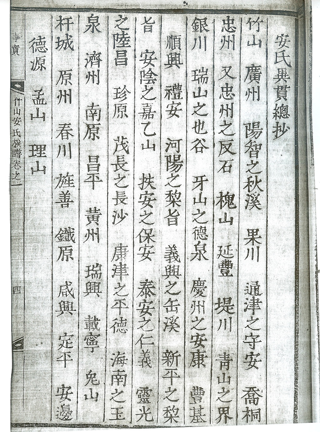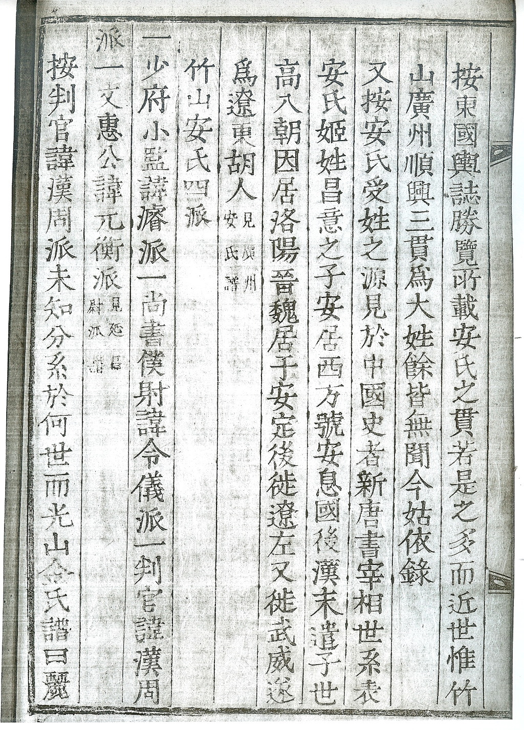 按安氏受姓之源, 見於中國史者。新唐書宰相世系表。安氏。姬姓昌意之子。安居西方號安息國, 後漢末, 遣子世高入朝, 因居洛陽。晋魏居于安定, 後徙遼左, 又徙武威。遂爲遼東胡人。(見廣州安氏譜)
