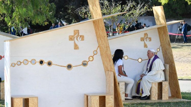 리스본 세계청년대회에서 젊은이에게 고해성사를 집전하는 교황 (Vatican Media)