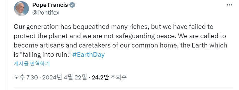 교황, 공동의 집 ‘지구’ 보호 책임 촉구 교황, '지구의 날(22일)' 맞아 소셜미디어 ‘X’(이전 트위터)에 메시지 올려 서종빈 선