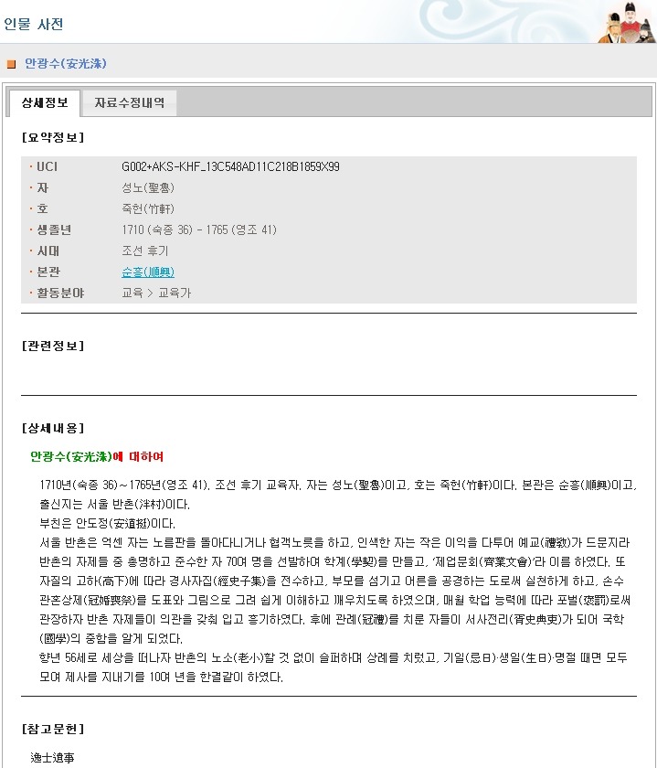 字聖魯自號竹軒泮村之俗剛者博奕任俠嗇者又逐逐於末利鮮能率禮敎光洙慨然曰太學首 善之地而俗如是可乎倡子弟之聰悟者七十餘人爲之契而名曰齊業文會隨其材高下各授經史子傳以事親 敬長之道蚤夜誨迪冠昏喪祭手自圖式令民易曉使毋越程朱之儀則每月朔悉聚其徒課業能否褒責以勸戒之於是泮村子弟多 興起率服光洙卽曰業貴優遊不然氣象迫窄去風雩詠歸之趣遠矣良辰選勝與其徒酣觴賦詩聯爲累百篇意寄悠遠由是成材者甚衆旣壯而冠爲胥吏爲典僕皆知敬釋菜名率職無闕也[주:保晚齋集]서명 : 國朝人物志v3