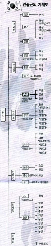 학계는 일제시대 독립에 뛰어든 안의사 일가는 40여명으로 추산한다. 이중 서훈자는 안의사를 비롯, 안의사의 동생 정근·공근, 사촌 명근·경근, 조카 춘생·봉생·원생·낙생, 안명근의 매제 최익형, 안춘생의 부인 조순옥 등 11명.