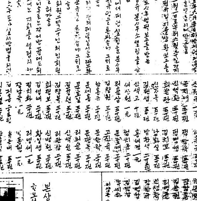 최덕여 五十전, 최학선 五十전, 박석기 五十전, 고병순 一元, 신원규 一元, 이홍근 五十전, 공대여 五十전, 정망옥 五十전, 신석환 五十전, 정병영 五十전, 최순관 五十전, 김치보 五十전, 신자옥 五十전, 남화실 五十전, 김현섭 五十전, 박완석 二十●전, 신석고 十전, 홍여경 一元, 서상헌 一元, 엄치운 二十전, 이춘삼 五十전, 문호여 三十전, 김창원 三十전, 고진숙 三十전, 안홍근 三十전, 문한락 三十전, 문세홍 三十전, 문정옥 三十전, 문호일 三十전, 이의순 三十전, 김중천 五十전, 신석순 五十전, 김장복 三十전, 이관삼 二十전, 최정보 五十전, 신병헌 三十전, 김성여 二十전, 황일성 五十전, 김치화 二十전, 이영세 一元, 장남극 一元, 박종형 一元, 김기홍 二十五전, 유근여 五十전, 최홍렬 二十전, 한춘식 十五전, 조승렬 二十전, 안창국 三十五전, 이춘삼 一元, ●●국 六十전, 김창오 六十전, 신운경 六十전, 석순보 六十전, 우치세 四十五전, 김주삼 四十五전, 석진보 四十五전, 김용섭 四十五전, 석준봉 四十五전, 김준화 四十五전, 김용기 二十전, 고도일 二十전, 김용택 二十전, 이영실 二十전, ●홍빈 五十전, 나근삼 二十五전, ●춘봉 二十전, 김군● 五十전, 김●순 五十전, 고주삼 三十전, 장남극 二十전, 이치● ●●전, 최●진 五十전, 김●● ●●전, ●●● ●●전, 신석률 五十전, 조●● 三十전, 이●● 二十전, 박●보 二十전, 김병● 三十전, 김인● 二十전, 박교화 三十전, 박●● 五十전, 채문팔 二十전, 김홍범 三十전, 장남홍 五十전, 김용삼 五十전, 김승권 三十전, 김●● 五十전, 이병준 三十전, 전창● 二十전, 신성학 三十전, 김상률 三十전, 강●규 五十전, 김임● 五十전, 김●남 四十전, 김인순 五十전, 김●남 三十전, 김형옥 五十전, 우●하 五十전, 손춘세 一元