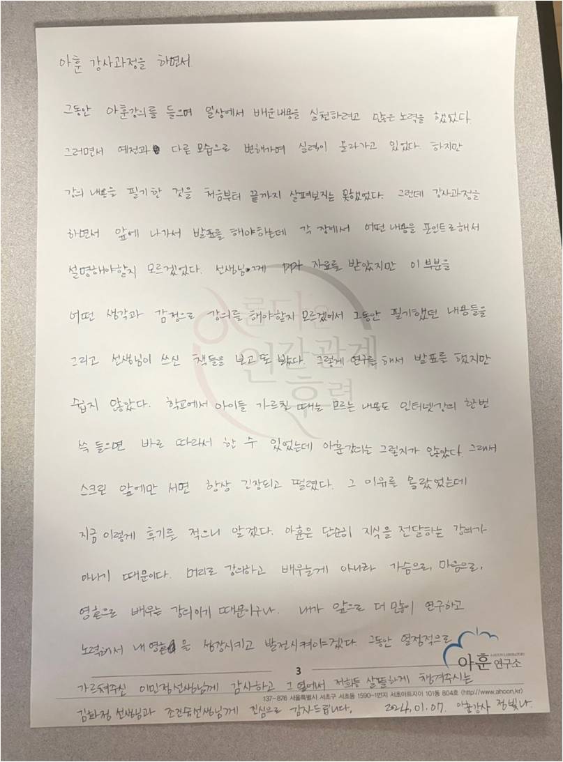 그동안 아훈강의를 들으며 일상에서 배운 내용을 실천하려고 많은 노력을 했었다. 그러면서 예전과 다른 모습으로 변해가며 실력이 올라가고 있었다. 하지만 강의 내용을 필기한 것을 처음부터 끝까지 살펴보지는 못했었다. 그런데 강사과정을 하면서 앞에 나가서 발표를 해야 하는데 각 장에서 어떤 내용을 포인트로 해서 설명해야할지 모르겠었다. 선생님께 PPT 자료를 받았지만 이 부분을 어떤 생각과 감정으로 강의를 해야할지 모르겠어서 그동안 필기했던 내용들을 그리고 선생님이 쓰신 책들을 보고 또 봤다. 그렇게 연구를 해서 발표를 했지만 쉽지 않았다. 학교에서 아이들 가르칠 때는 모르는 내용도 인터넷 강의 한 번 쓱 들으면 바로 따라서 할 수 있었는데 아훈 강의는 그렇지가 않았다. 그래서 스크린 앞에만 서면 항상 긴장되고 떨렸다. 그 이유를 몰랐었는데 지금 이렇게 후기를 적으니 알겠다. 아훈은 단순히 지식을 전달하는 강의가 아니기 때문이다. 머리로 강의하고 배우는 게 아니라 가슴으로, 마음으로, 영혼으로 배우는 강의이기 때문이구나. 내가 앞으로 더 많이 연구하고노력해서 내영혼을 성장시키고 발전시켜야겠다. 그동안 열정적으로 가르쳐 주신 이민정 선생님께 감사하고 그 옆에서 저희들 살뜰하게 챙겨주시는 김화정 선생님과 조진숙 선생님께 진심으로 감사드립니다. 2024. 01. 07 아훈강사 정빛나.
