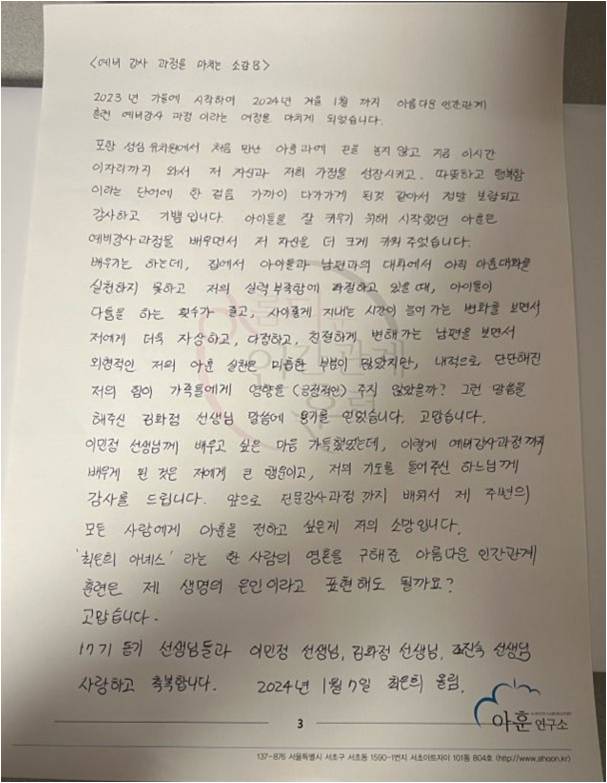 2023년 가을에 시작하여 2024년 겨울 1월까지 아름다운 인간관계 훈련 예비강사 과정이라는 여정을 마치게 되었습니다. 포항 성심유치원에서 처음 만난 아훈과에 끈을 놓지 않고 지금 이 시간, 이 자리까지 와서 저 자신과 저희 가정을 성장시키고 따뜻하고 행복함이라는 단어에 한 걸음 가까이 다가가게 된 것 같아서 정말 보람되고 감사하고 기쁨입니다. 아이들을 잘 키우기 위해 시작했던 아훈은 예비강사 과정을 배우면서 저 자신을 더 크게 키워 주었습니다. 배우기는 하는데 집에서 아이들과 남편과의 대화에서 아직 아훈 대화를 실천하지 못하고 저의 실력 부족함에 좌절하고 있을 때, 아이들이 다툼을 하는 횟수가 줄고, 사이좋게 지내는 시간이 늘어 가는 변화를 보면서 저에게 더욱 자상하고, 다정하고, 친절하게, 변해가는 남편을 보면서 외형적인 저의 아훈 실천은 미흡한 부분이 많았지만, 내적으로 단단해진 저의 힘이 가족들에게 영향을 (긍정적인) 주지 않았을까? 그런 말씀을 해주신 김화정 선생님 말씀에 용기를 얻었습니다. 고맙습니다. 이민정 선생님께 배우고 싶은 마음 가득했었는데, 이렇게 예비강사 과정까지 배우게 된 것은 저에게 큰 행운이고, 저의 기도를 들어주신 하느님께 감사를 드립니다. 앞으로 전문강사 과정까지 배워서 제 주변의 모든 사람에게 아훈을 전하고 싶은게 저의 소망입니다. ‘최은희 아녜스’라는 한 사람의 영혼을 구해 준 아름다운 인간관계 훈련은 제 생명의 은인이라고 표현해도 될까요? 고맙습니다. 17기 동기 선생님들과 이민정 선생님, 김화정 선생님, 조진숙 선생님 사랑하고 축복합니다. 2024년 1월 7일 최은희 올림