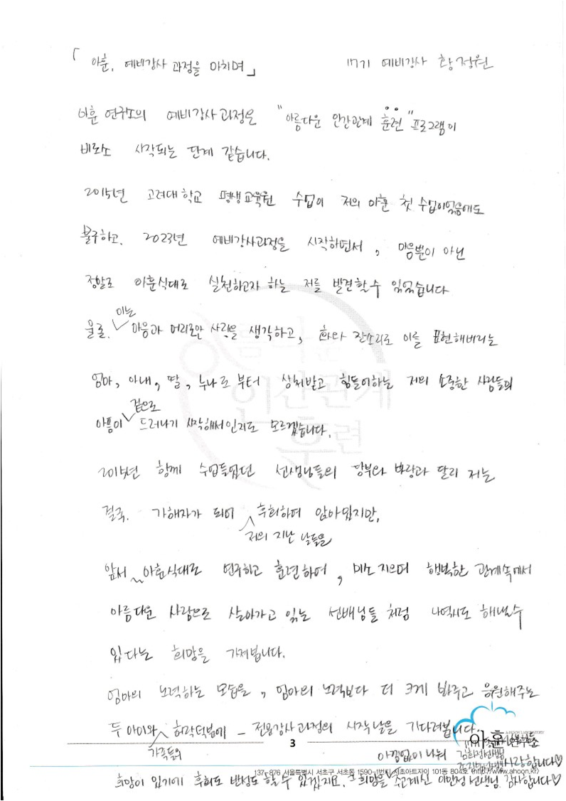 아훈 연구소의 예비강사 과정은 “아름다운 인간관계 훈련” 프로그램이 비로소 시작되는 단계 같습니다. 2015년 고려대학교 평생교육원 수업이 저의 아훈 첫 수업이었음에도 불구하고 2013년 예비강사과정을 시작하면서, 마음뿐이 아닌 정말로 아훈식 대로 실천하고자 하는 저를 발견할 수 있었습니다. 물론 이는 마음과 머리로만 사랑을 생각하고, 화와 잔소리로 이를 표현해버리는 엄마, 아내, 딸, 누나로부터 상처받고 힘들어하는 저의 소중한 사람들의 아픔이 겉으로 드러나기 시작해서인지도 모르겠습니다. 2015년 함께 수업 들었던 선생님들의 당부와 바람과 달리 저는 결국 가해자가 되어 저의 지난 날들은 후회하며 앉아 있지만, 앞서 아훈식 대로 연구하고 훈련하며, 미소 지으며 행복한 관계 속에서 아름다운 사람으로 살아가고 있는 선배님들 처럼 나 역시도 해낼 수 있다는 희망을 가져봅니다. 엄마의 노력하는 모습을, 엄마의 노력보다 더 크게 봐주고 응원해주는 두 아이와 가족들의 허락 덕분에 전문강사 과정의 시작 날을 기다려 봅니다. 희망이 있기에 후회도 반성도 할 수 있겠지요. 희망을 아낌없이 나눠주고 계신 이민정 선생님, 감사합니다. 김화정 선생님. 조진숙 선생님 고맙고 사랑합니다. 2024년 1월 7일 황정원