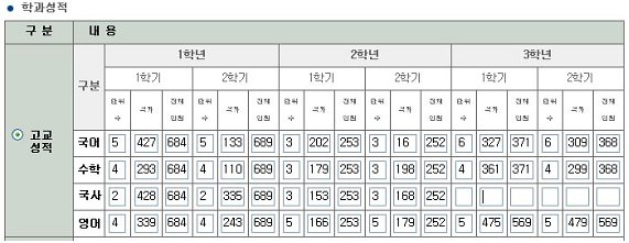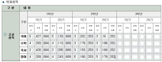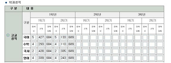 성적은 국어,수학,국사,영어 과목의 성적을 고등학교 생활기록부에서 찾아서 직접 입력합니다. 빨간색 동그라미로 표시된 부분이 여러분이 직접 입력해야 할 성적입니다. 입력은 아래 그림처럼 합니다