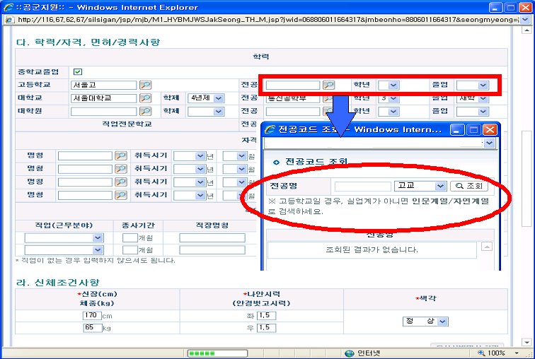 * 고등학교 전공란에는 "인문계열", "자연계열" 또는 실업계의 경우 "전공" 입력