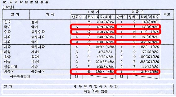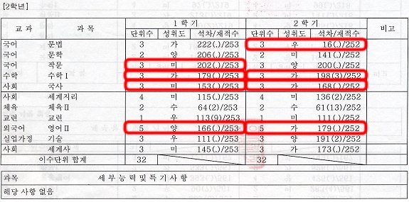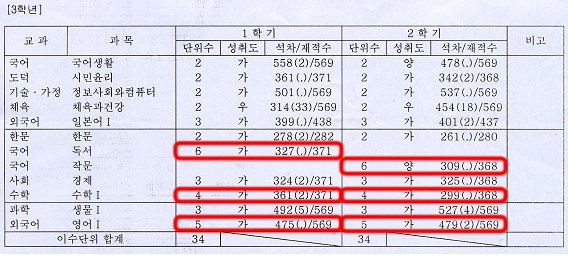 * 생활기록부의 성적입력시 어떤 학년 혹은 학기에 국어, 수학, 국사, 영어 과목 중