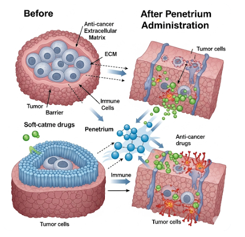 페니트리움은 이 경화된 ECM을 부드럽게 만들어(ECM 리프로그래밍) 항암제와 면역세포가 암조직 내부로 효과적으로 침투할 수 있도록 돕는 역할을 합니다.