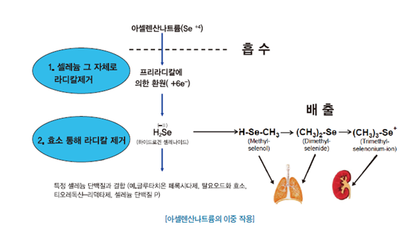 무기 셀레늄인 아셀렌산나트륨은 수동확산을 통해 체내에 빠르게 흡수되어 98% 이상이 하이드로겐 셀레나이드로 즉시 전환되며 투여 후 15분이 지나면 셀레늄 단백질로 합성되어 약리기능을 수행한다. 활용되지 않은 셀레늄 분리성분들은 이온상태로 호흡이나 소변을 통해 배설되기 때문에 축적되지 않아 부작용이 없다.