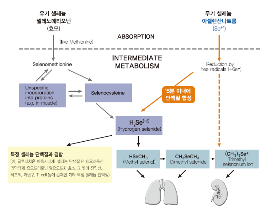 식품에 의해 흡수되는 유기셀레늄은 대부분 셀레노메티오닌 형태로 존재하며 흡수과정이 복잡하여 하이드로겐 셀레나이드로 전환되기까지 매우 많이 시간이 소요되고 복용량의 0.1~10% 정도밖에 전환되지 않는다. 또한 과잉 공급된 유기셀레늄은 근육과 머리카락 등에 축적되어 문제를 일으킬 수 있기 때문에 고용량 투여를 권장하지 않는다.