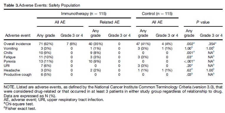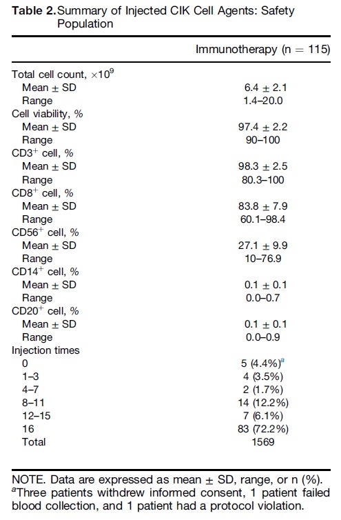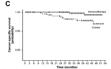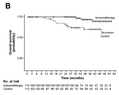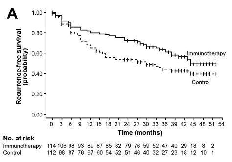 이뮨셀 치료 시 치료를 받지 않은 대조군에 비해 암 재발이 없는 생존 기간(RFS: Recurrence-free survival)이 14개월 증가했고(HR 0.63; 95% CI)overall survival, cancer-specific survival 모두 이뮨셀 군에서 통계적으로 의미있는 연장을 보였습니다