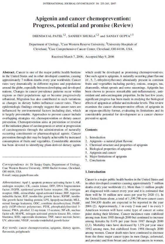 ▲ Deendayal Patel, Sanjeev Shukla, Sanjay Gupta(2007), <아피제닌과 암 화학예방>, 국제종양학지, 30호