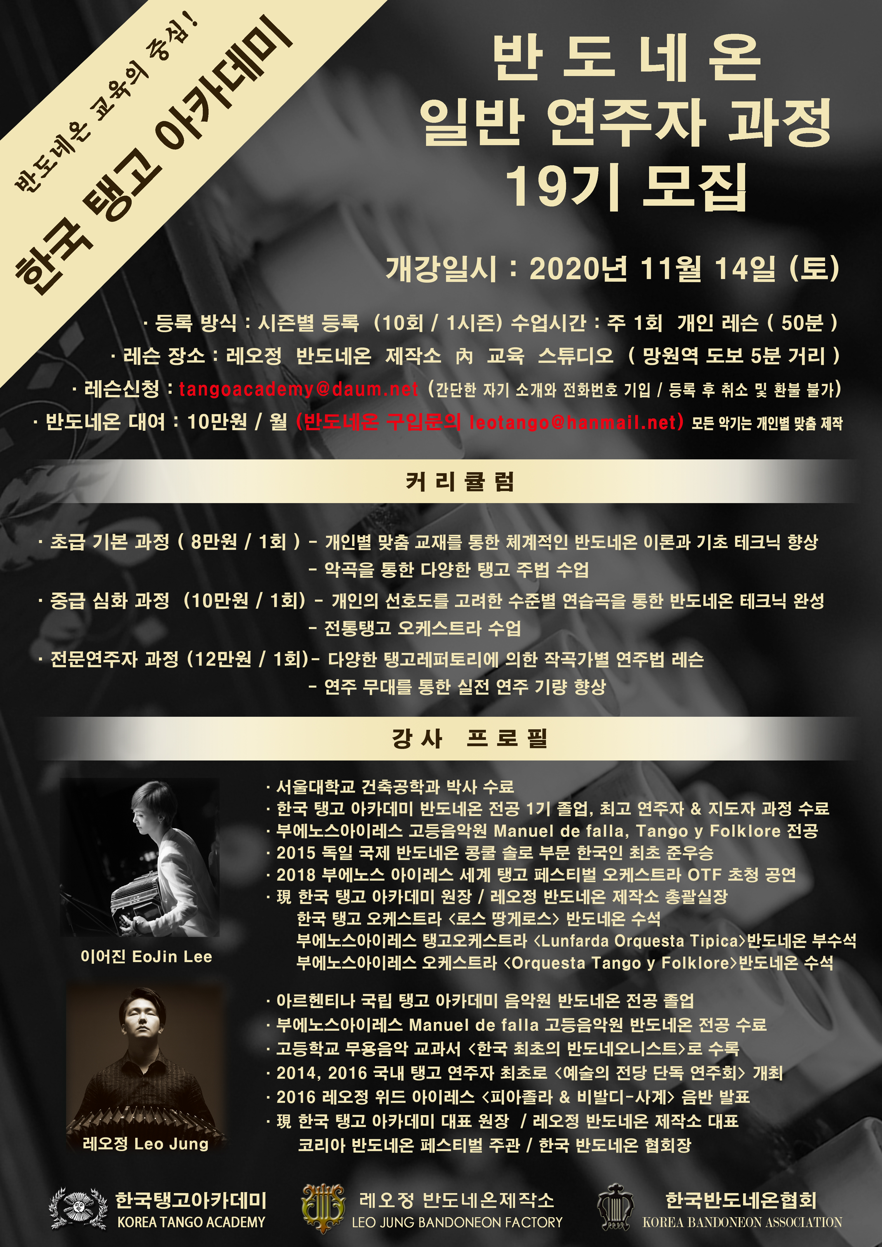 [마감] 반도네온 일반 연주자 과정 19기 모집 작성자탱고아카데미|작성시간20.10.27|조회수372 목록 댓글 0 글자크기 작게가 글자크기 크게가 다음검색 현재 게시글 추가 기능 열기 북마크 공유하기 신고 센터로 신고 댓글 댓글 0 댓글쓰기 답글쓰기 댓글 리스트