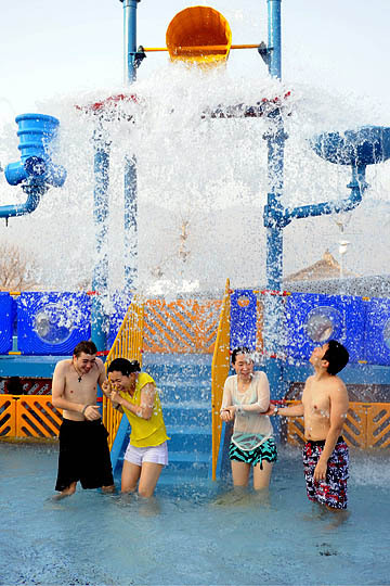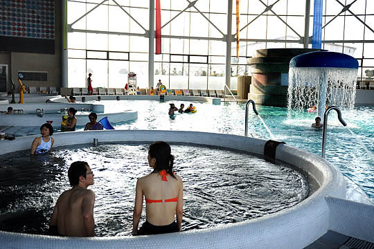 수영복으로 갈아입은 야애 씨는 따뜻한 온천에 몸 담근 후 여기저기 시설을 돌아봤다. "온천에서 폭포와 미끄럼틀 같은 물놀이 시설은 처음 봤어요. 고향의 작은 온천에서는 상상도 못하는 일이에요"라며 그녀는 더듬더듬 한국어로 말했다.