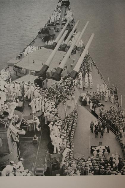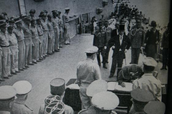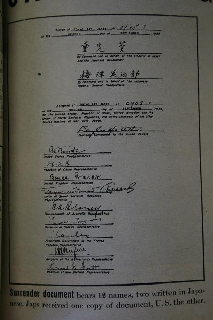 일본이 항복 문서에 서명하는 미해군 미조리함의 하늘 위로는 400대의 B-29가 떠있고 그 밑으로 1,500대의 전투기가 편대를 지어 있었다.