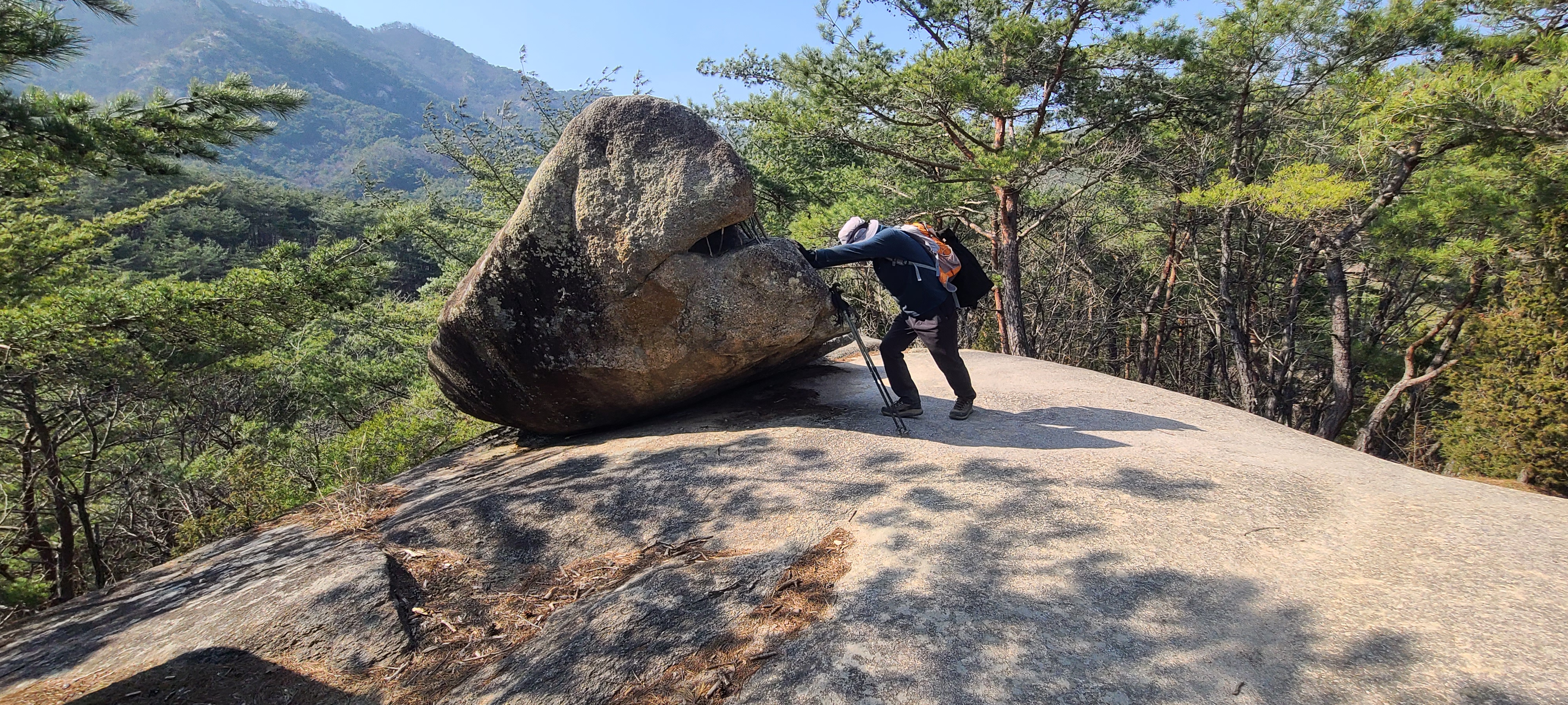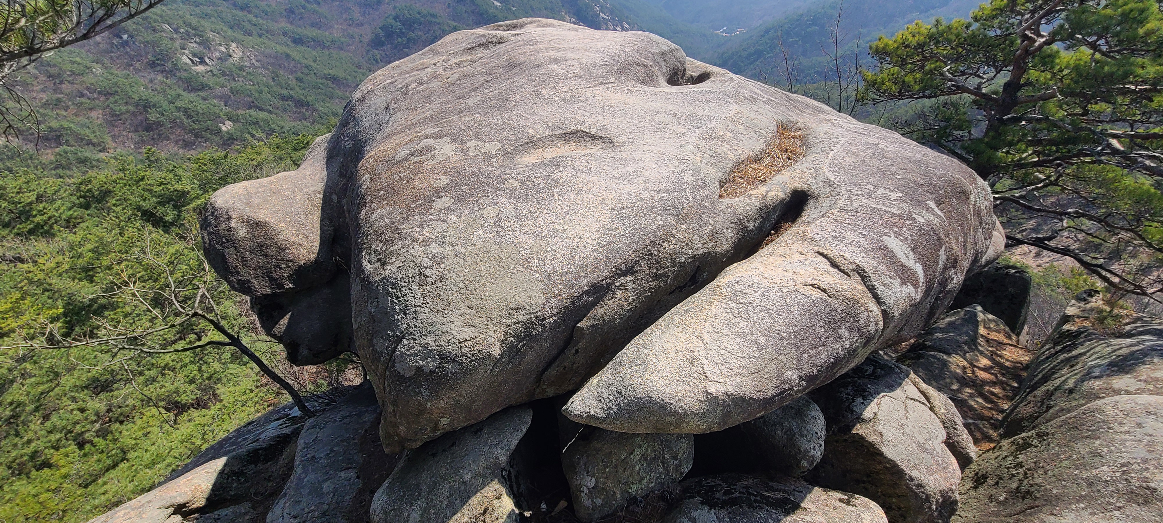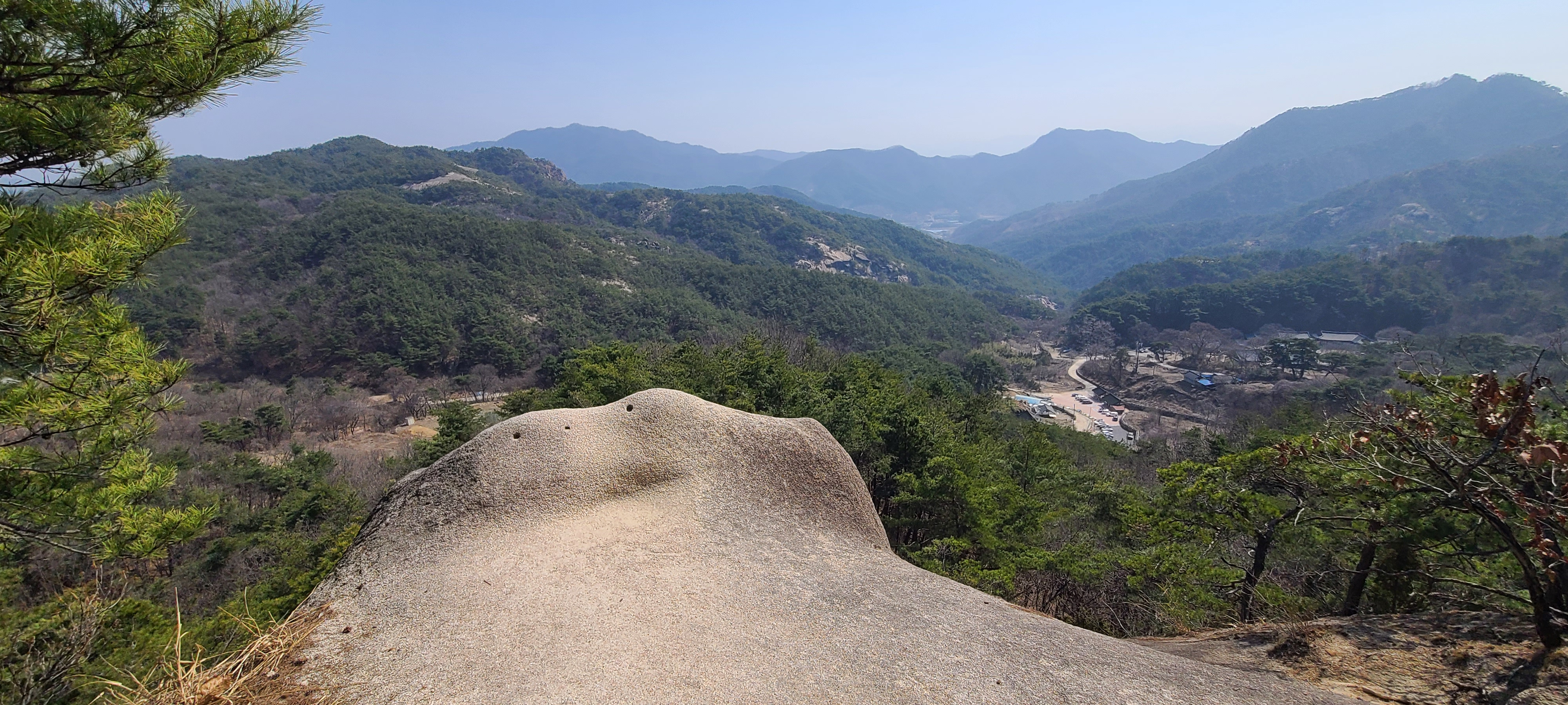 조금 오르니 이런 바위가 보이고 멀리 마니산 능선이 보인다