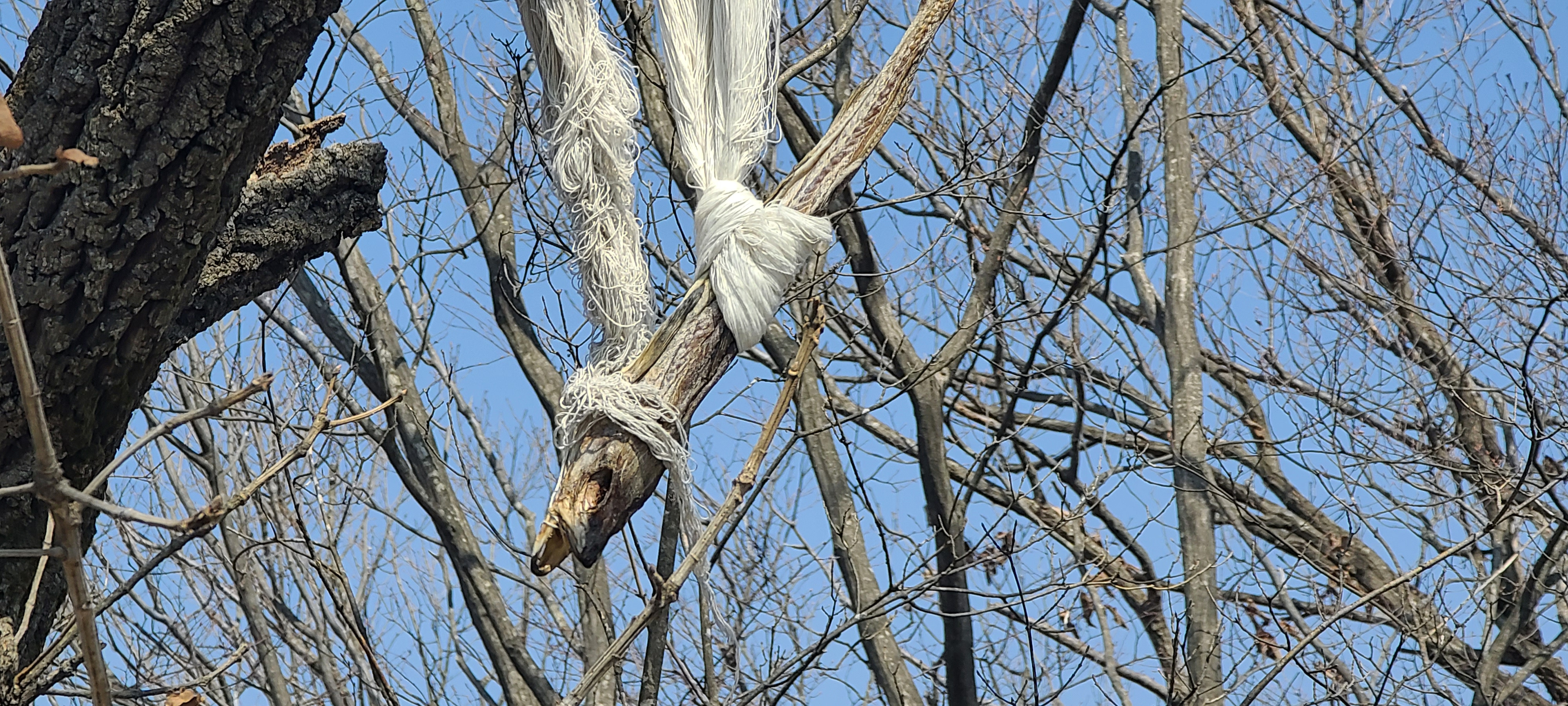 돌탑 아래 나무가지에 저 명태란 녀석, 죽어서도 생고생이다.