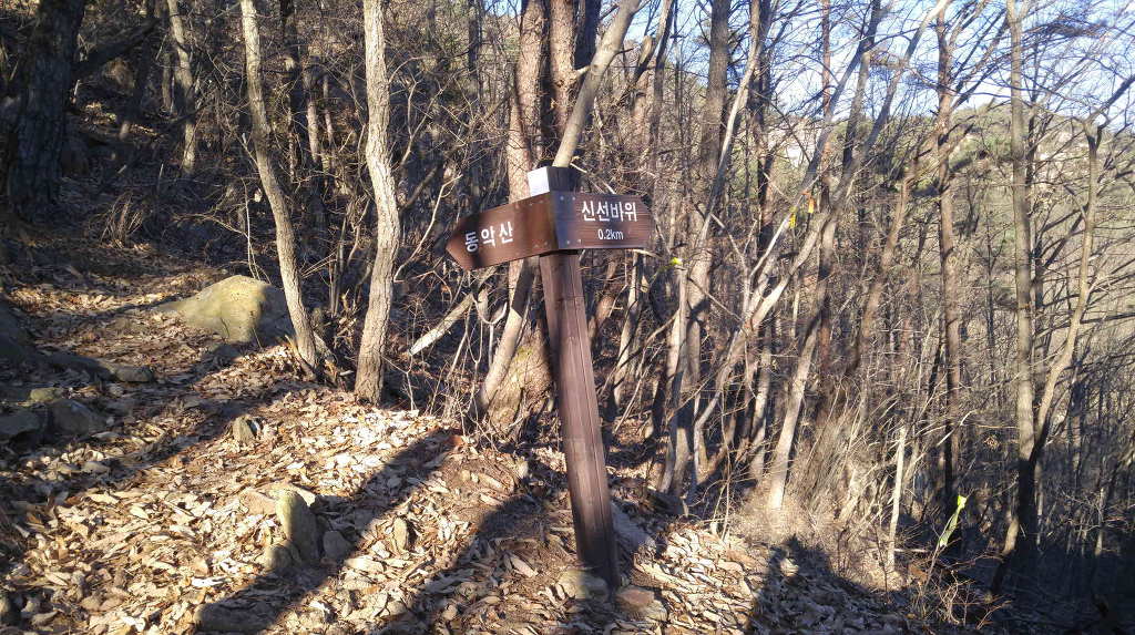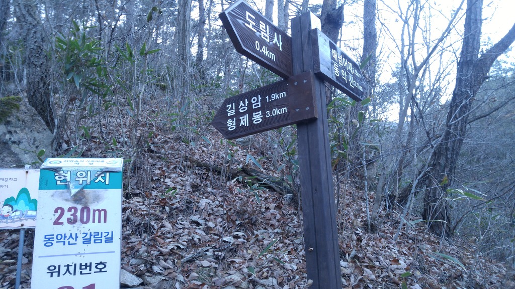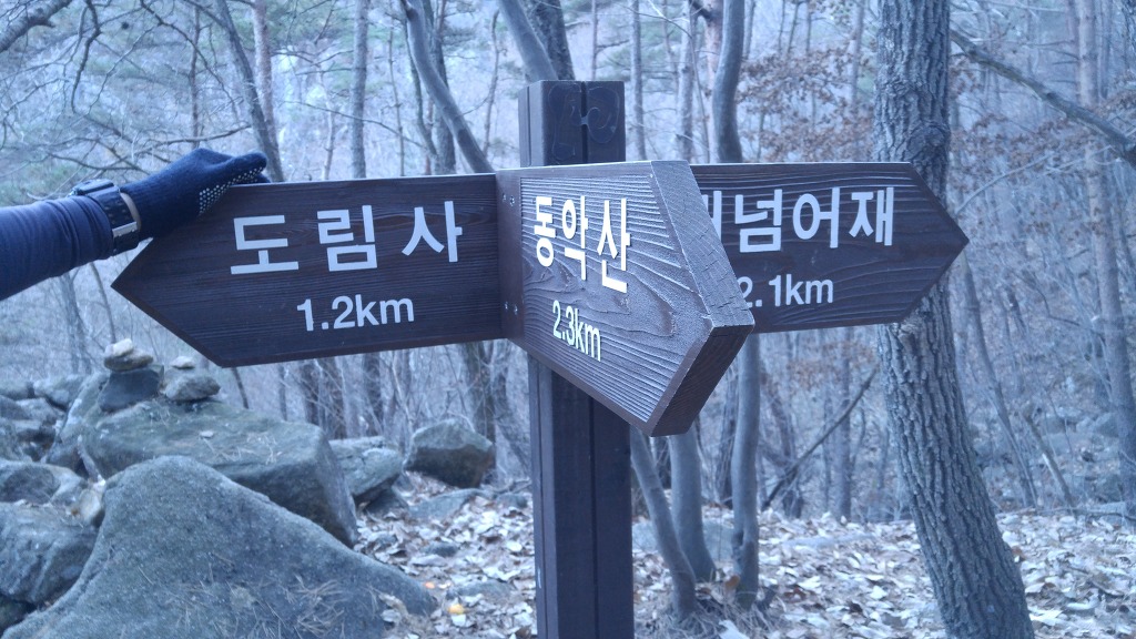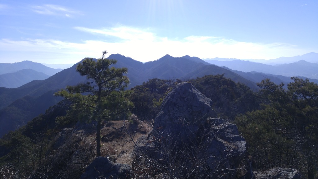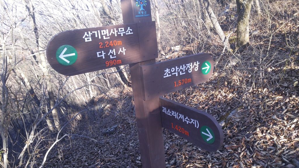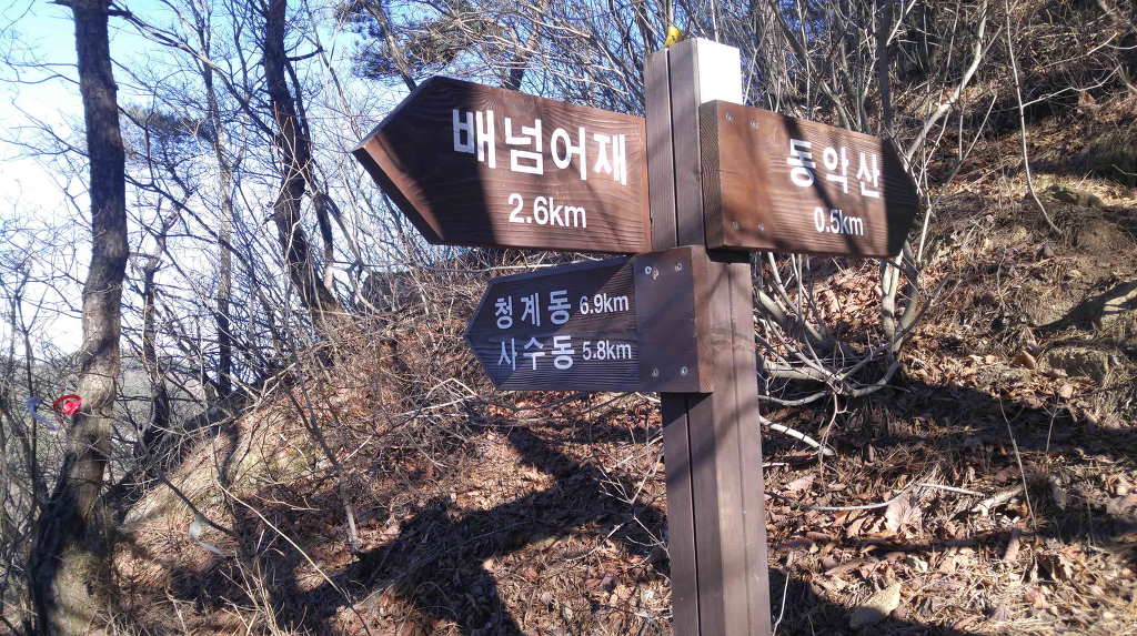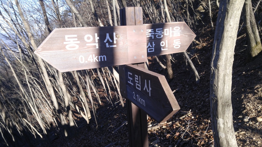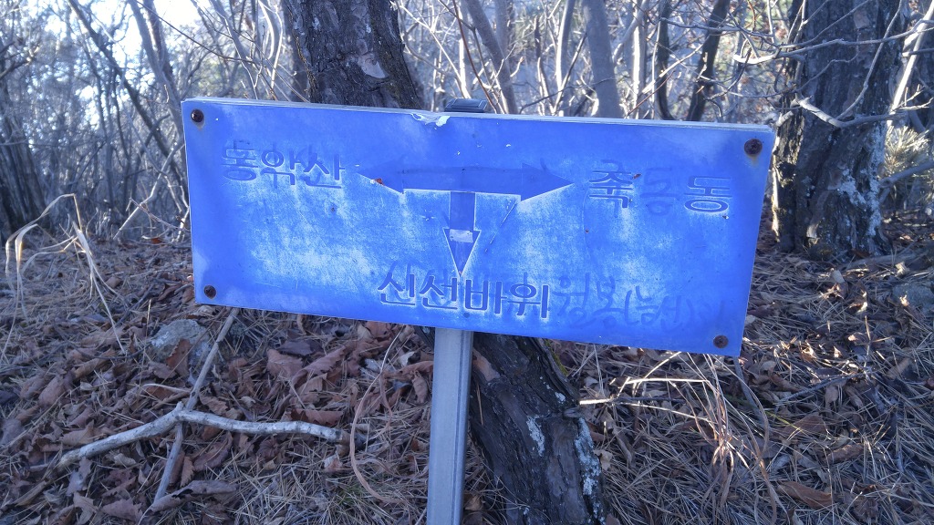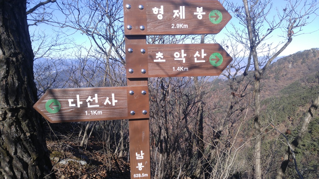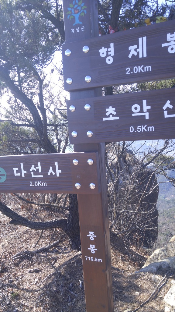 01. 산행기점 : 전남 곡성군 삼기면 괴소리 괴소마을회관 02. 산행종점 : 전남 곡성군 곡성읍 월봉리 도람사 03. 산행일자 : 2016년 12월 10일(토요일) 04. 산행날씨 : 맑고 시야 좋음 05. 산행지도 06. 산행코스 : 괴소마을회관--->괴소저수지--->벌목지--->암봉--->본능선의 좌측 봉우리--->되돌아나와 중봉방향--->중봉--->초악산--->형제봉 삼거리에서 대장봉 방향--->대장봉--->배넘이재--->동악산 청계방향 갈림길에서 우측 동악산 방향--->동악산--->신선바위--->도림사(12k, 7시간) 07. 원점회귀 : 도림사에서 택시불러 괴소마을회관(14000원) 08. 찾아가기 : 호남고속도로 곡성IC--->좌측 삼기면 방향 200미터 우측 삼기중학교(폐교)--->괴소마을(부산에서 휴식포함 3시간) 08. 산행일기 : 간밤에 11월 말 제대한 우리집 돼지새끼(돈아)가 아빠따라 등산을 나서려 하니 동행하기로 하였습니다. 몇번의 휴가 중엔 절대 산에 가지않겠다고 공언한 바가 있습니다. 산에 가려는 것은 벌써 복무 중 고생했던 일이 잊혀졌다는 의미도 있겠지요. 아무튼 곡성까지 가는 여정에는 아들놈이 음악DJ가 되어 원하는 곡이 있거든 신청하라는 것이었습니다. 아비의 마음을 아는지 송창식 노래를 많이 틀어주었습니다. 아들이 듣는 곡은 아이유와 김창환이 부른 '너의 의미'는 좋은 노래라고 기억됩니다. 등산 시작할 무렵에는 지가 무거운 배낭을 지겼다고 우기는 것도 한편으로 흐뭇했습니다. 원래 이 산을 가게된 동기는 지난번 남원의 고리봉 능선을 내려왔을 때 섬진강이 가로막아 놓은 동악산, 촛대봉, 삼인봉 등을 오르고 싶다는 마음이 일어났었더랬지요. 그럴 봐에야 차라리 곡성쪽 초악산부터 종주하듯이 동악산, 촛대봉으로 내려오는 것이 개운할 것같았지요. 십수년전 동악산은 오른 적이 있지만 초악산은 미답지인 것도 여기를 기점으로 잡은 이유가 되겠네요. 그런데 대장봉에서 점심을 먹으면서 아들이 무릎에 통증이 있다는 것이었습니다. 특공대 통신병으로 근무하면서 무거운 장비를 지고 산으로 오르면서 생긴 만성지병같았습니다. 그러니 오늘 저쪽 남원의 청계동으로 가는 것은 뒷날로 미루어야겠습니다. 본인도 하산하면서 무릎고통을 많이 느꼈겠지요. 천천히 하산한 결과 많은 시간이 소요되었습니다. 초악산은 최악산으로도 불리는데 아마 초악산이 정확한것 같습니다. 초는 뱁새를 나타내는 것으로 산세가 새를 닮은 데서 비롯된 것인데 최악산으로 불리게 되었다는 것입니다. 초악산 정상은 수풀에 가려있지만 여기에 이르는 여정은 아기자기하고 주위의 조망도 좋아 암봉을 즐기는 산객의 사랑을 받을 만합니다. 특히 대장봉에서 조망은 압권입니다. 순창과 담양, 장성, 광주의 산들까지 관측되어 안복을 누릴만 합니다. 대장봉에서 동악산 어귀까지는 말 등을 타고 있는 기분으로 그야말로 안부여서 내리고 싶은 사람은 배넘이재에서 하산해도 되겠습니다. 이 구간은 봄에 야생화를 즐기면서 걷는 것도 좋겠습니다. 이런 안부에 갑자기 치솟은 동악산은 멀리서 보아도 특이한 암봉을 자랑합니다. 그래서 동악산의 岳도 험한 산을 말할 때 흔히 쓰는 그 岳이 아니라 풍류 樂을 쓰니 많이 착각도 되겠습니다. 이 지역에 우수한 인재가 과거에 급제하면 산이 動해 風樂을 울리는 소리가 들렸다는 전설이 있답니다. 세월이 흘러 이제 나무계단까지 설치하여 오르는 이의 수고를 줄여주고 있습니다. 여기선 멀리 남원의 문덕봉, 고리봉, 남원 시내, 고당봉, 반야봉도 아련하고 바로 코앞 곡성시가지도 훤합니다. 조금전 올랐던 대장봉과 형제봉 사이로 초악산이 고개를 내밉니다. 하산길은 원래 곡성 시내쪽으로 잡으려 하였는데 신선바위 아래 좌측길로 접어들어 저쪽 능선으로 붙어야 겠다는 생각에 그만 알바를 하고 말았습니다. 헛고생을 30분 정도 한것같습니다. 무릎이 좋지 않은 아이게게 괜히 부담을 주었네요. 그렇지 않았으면 도림사 대신에 월봉리로 하산하였을 겁니다. 다음 봄이나 여름에는 청계동에 차를 세워놓고 삼인봉, 촛대봉, 동악산, 월봉리 코스를 올라야겠다는 여정을 머리에 담고 하산을 끝냅니다. 기점인 괴소마을에서 본 산입니다. 검장산이네요 괴소저수지 뒤 첫 암봉입니다. 도로안내지도에는 반월산으로 되어 있네요 좌측 능선은 삼기면사무소, 다선사로 흘러갑니다. 괴소저수지입니다 바로 앞산은 통명산이랍니다 .원대복귀하면서 기사님에게물어보니 건너편 산이 통명산이라네요 멀리 조계산 방향입니다 고개를 내미는 산이 백아산인지 모르겠습니다 도로 안내지도에는 반월산으로 되어 있는 정상입니다 반월산에서 본 가야할 능선입니다. 오른쪽 고개를 내미는 산이 형제봉인듯 합니다 호남고속도로도 보입니다 비상해야지 우측으로 가면 삼기면 방향으로 ... 이제 능선길입니다 멀리 지리산 주능선입니다. 가운데 반야봉이네요 가운데 아주 멀리 하동 삼신봉인듯 합니다 산 많네요. 구분이 어렵습니다. 지리산 방향 저의 돼지새끼입니다. 동악산이 언뜻 보입니다 중봉이고요 초악산이 보입니다. 그 우측은 형제봉이고 좌측은 대장봉입니다 대장봉의 이정표입니다 형제봉을 바라보며 식사를 합니다 멀리 좌측은