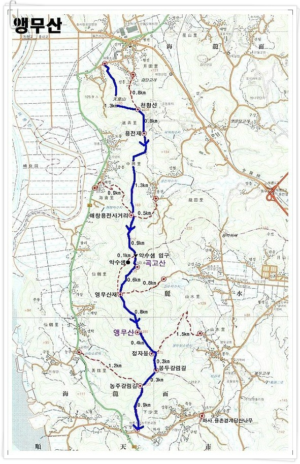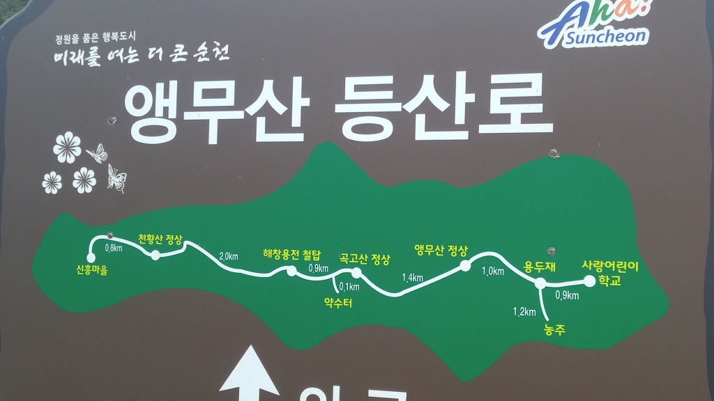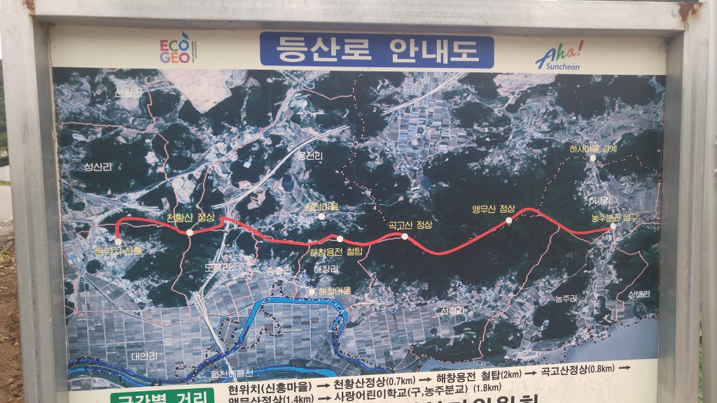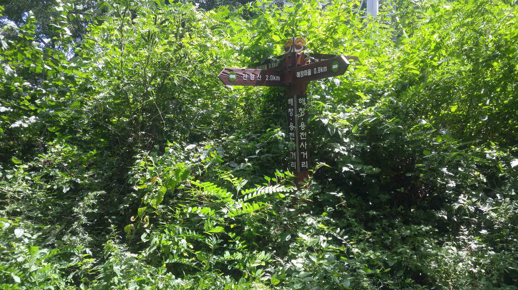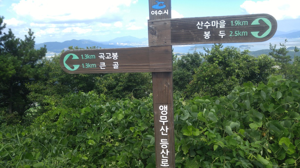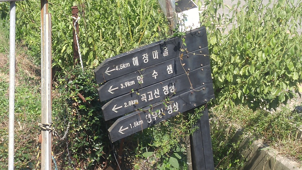 01. 산행기점 : 전남 순천시 해룡면 도룡리 신흥마을 02. 산행종점 : 전남 순천시 해룡면 하사리 죽동마을 03. 산행날씨 : 구름 약간 04. 산행일자 : 2017년 8월 9일(수요일) 05. 산행지도 <이 지도는 기점과 종점이 호산광인의 루트와 다릅니다. 참조하세요> 06. 산행코스 : 순천 해룡면 해룡초등 및 도서관 부근 신흥마을--->골짜기로 진입하여 공터 및 앵무산 안내판--->천황사 입구 좌측 이정표--->개짓는 소리 듣고 조금 오른 후 좌측 진입--->곡고산 안내판--->천황산 및 KT 중계안테나--->안테나 시설물에 바짝붙어 직진(사실 길없음)--->수풀지대~~~~--->용전고개--->도로가 나오는 용전고개에서 우측으로 진입하여야 하나 수풀로 포기하고 용전마을--->용전마을 민가끝날 때쯤 경운기 우측 그러니까 가운데길(가장 우측 담으로 붙지말고)--->등산길 이정표 보고 진입--->용전사거리--->곡고산--->앵무산--->정자 우측--->봉두방향--->능주삼거리에서 직진--->여수와 순천의 경계지대 및 당산나무--->우측방향으로 걸어와 죽동 정류장 07. 산행거리 및 시간 : 10k, 4시간 30분(중식포함) 08. 차량회수 : 산행코스가 거의 직선이어서 차량회수를 위해 원점회귀하려면 죽동 정류소에서 40분 간격으로 있는 버스를 타야합니다. 호산광인은 바빠 택시를 부르려는데 정류장에 스쿠터를 몰고 있는 50대 중반의 깍은 머리의 사나이가 태워주려하여 거절하지 않았습니다. 덕분에 1시간 이상 시간을 절약한 것같습니다. 09. 주의사항 : 여름철이라 신흥마을에서 죽전고개까지는 수풀로 길이없으니 해창에서 오르는 것이 좋을듯 합니다. 천황산 가보아야 별것 없으므로 ...굳이 고집을 피울 건 없다고 봅니다. 겨울철이면 모를까... 10. 찾아가기 : 남해고속도로 광양IC--->순천시 해룡면 사무소 앞--->농협하나로마트--->우측 해룡초등학교--->삼거리 신흥마을 표지석 좌측진입--->앵무산 안내도 및 공터주차 12. 산행일기 : 그동안 팔목고장으로 어른 산소를 들르지 못해 부담스러웠는데 오늘은 팔목시험도 할 겸 길을 나섭니다. 산소 부근의 산을 가볍게 오른 후 가기로 합니다. 앵무산!!! 들었을 때 그렇게 어감이 좋았습니다. 앵무산을 가기로 한 건 순전히 이름때문입니다. 鶯(꾀꼬리 앵)인지 鸚(앵무새 앵)인지 알 수 없고 무도 鵡(앵무새 무) 舞(춤출 무)인지 모르겠습니다. 나름대로 생각할 때 꾀꼬리가 춤추는 산인지 아니면 앵무새 산인지 궁금해 하다가 후자라고 생각했습니다. 후자가 문헌에 많이 등장하므로... 아무튼 도회지 산의 진입로는 찾기 어려운데 마음을 비우고 해룡면 초등학교지나 신흥마을 입석 옆에 안내도를 보고 진입하여 공터에 차를 세우고 직진하여 들어가니 편안합니다. 안내도와 이정표와는 달리 등로에는 사람의 흔적이 없어 수풀로 가득하고 음침하기까지 합니다. 이건 천황산 정상이기도 한 KT중계안테나가 있는 곳까지는 참을만 했습니다. 그 이후 용전고개까지는 악전고투로 나 자신을 원망했습니다. 왜 여기까지 왔냐교? 그래도 회군할 수없어 계속 거미줄과 투쟁하면서 나아가니 호화로운 무덤군이 나오고 좌측은 커테이너 박스가 있는 오름길이 곡고산인지 저멀리 삼각형으로 보이는 산인지 알 수 없어 그 고개길에서 정면으로 트럭옆에 휴식하고 있는 친절한 아저씨에게로 다가갔습니다. "곡고산이 어딥니까?"하니 정면을 가르킵니다. "그리로 가려면 진입로가 어딘가요?"하니 "도로 건너 저 기슭인데 칡넝쿨로 고생할 겁니다. 차라리 용전마을로 진입하여 오르는 것이 보다 낫습니다"한다. 조금 전 수풀을 헤친 경험이 없었다면 도로 건너편으로 들어갔을 겁니다. 용전마을로 걸어들어가 여러 차례 시행착오 끝에 [등산로]라는 이정표를 만나니 기생 올애비만난 기분이었습니다. 용전사거리에 도착하니 길이 깨끗해 앵무산은 여름철엔 해창에서 올라야 한다는 신념이 생겼습니다. 이리저리 시간을 많이 소비한 끝에 용전사거리 응달진 곳에서 식사를 하였습니다. 곡차도 한잔하는데 순천 '우리나우'쌀막걸리는 참으로 맛이 있어 한병 다 마실뻔했습니다(술엔 관한 한 자제력이 강하다). 정상석이 없는 곡고산에 서니 시야가 확 터입니다. 광양만은 말할 것 없고 순천시가지 멀리 백운산, 억불봉 그리고 고흥반도 등도 뜬구름 아래 잘 관측되니 오를 때 고생했던 기분도 사라져 버립니다. 별도의 산처럼 보이는 앵무산도 좌측으로 부드럽게 도니 금방 정상에 도착합니다. 바로 앞 여자만과 하동 금오산, 남해 망운산까지 보이니 저 산 아래에서 태어난 친구들도 머리 속에 떠오릅니다. 해룡초등학교 부근 신흥마을 삼거리에 도착하면 오늘 등산기점을 제대로 찾은 겁니다 이 마을 이정석 옆에 안내도까지 붙어있으니... 공터에 차를 세우고 진행방향 직진합니다 천황산 철탑도 보입니다 여기를 지나 견공들의 합창소리에 주인이 나오고 좌측길로 안내합니다 여름철이라 사람의 흔적이 없습니다. 더 좋은 산으로 갔겠지요 KT 철탑겸 천황산. 여기서 시간이 많이 허비되었습니다. 표시한대로 가면 길이 없으니... 없어도 밀고 직진해야 합니다 천황산 표지목을 일으켜세울 여유도 없습니다 곡고산이 보이는 것 같은데 이렇게 진행을 방해할 수