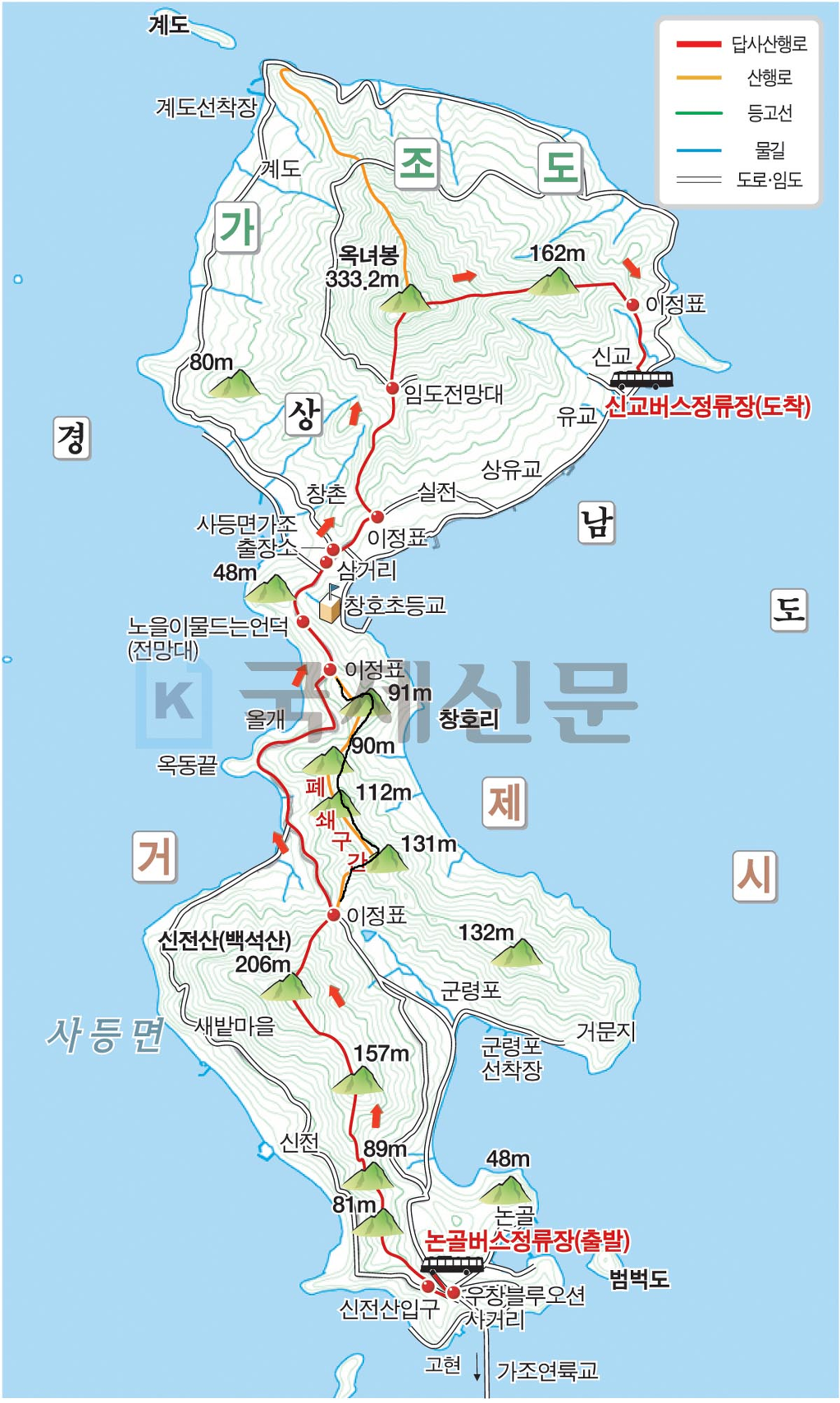 01.산행기점 : 경남 거제시 사등면 가조도 논골마을 입구 주차 02.산행종점 : 경남 거제시 사등면 가조도 신교마을 03. 산행일자 : 2017년 4월 22일(토요일) 04. 산행날씨 : 좋음 05. 산행지도 : 국제신문 06. 산행코스 : 논골마을 입구에서 뒤돌아나와 우창 블루오션 사거리에서 우측 금룡정사 방향--->신전산입구 이정표--->신전산(백석산 : 정상석 없음)--->도로 건너편 이정표보고 직진(폐쇄구간 무시)--->안부~~~--->아래쪽 집 한채보이고 철조망 나오면 우측 산소에서 허리감고 정상--->큰도로 합류--->노을이 물드는 언덕(전망대)--->가조면 출장소--->실전방향으로 가다가 이정표보고 좌측진입--->데크 전망대--->옥녀봉 및 정자--->선교방향 --->신교 버스정류장(10k, 3시간 20분) 07. 찾아가기 (1) 갈 때 : 동마산IC 마산방향--->고성읍--->통영--->거제 가조도 (2) 올 때 : 거제시내--->거가대교--->가덕도--->부산 08. 산행일기 : 팔목부상으로 가까운 곳으로 갑니다. 거제 가조도의 옥녀봉으로 달려갑니다. 전국 산 중에 옥녀봉은 참으로 많습니다. 거제에도 칠전도 옥녀봉도 있고 일운면 지세포 부근에도 옥녀봉이 있습니다. 몇년전 식구들과 가조도에 들렀다가 옥녀봉을 보아두었더랬지요. 마침 국제신문이 소개하고 있어 달려갔습니다. 폐쇄구간을 지날 때 외에는 긴장감도 없이 그냥 고향 뒷산가는 기분으로 편안하게 올랐습니다. 좋은 전망은 3곳에서 나타나는데, 첫째는 노을이 물드는 언덕의 전망대에서 고성과 통영의 바다와 산을 바라봅니다. 주로 고성의 구절산, 거류산과 통영의 벽방산을 바라보는 통쾌함은 천개산에서 이들 산을 바라볼 때와 또 다른 느낌을 갖습니다. 둘째는 옥녀봉을 얼마오르지 않은 곳에 데크 전망대에서는 멀리 삼성조선과 그 좌측의 앵산이 쌍둥이로 다가오고 다시 한 참 우측에는 거제의 진산들이 즐비합니다. 정확하게 지적할 순 없지만 국사봉, 계룡산, 가라산, 노자산, 산방산 등이 복잡하게 얽혀있습니다. 마지막 조망은 옥녀봉 정상에서 열려있는데 나무가지가 방해만 하지않는다면 최고의 조망처일텐데 이건 욕심이겠죠. 2시경 신교마을에 도착해 버스시간을 알아보니 3시,5시에 있어 일단 걸어보다가 무언가를 타기로 했습니다. '노을이 있는 언덕'에 이르니 택시가 웃으면서 오기에 얼른 집어탔습니다. 아주 싸게 6000원 입니다. 논골마을 입구에 차를 세우니 동백관광차고지인지 관광버스가 많이 보입니다 논골마을에서 되돌아나와 이 건물을 보고 우측으로 오릅니다. 금룡정사 방향으로 신전산으로 들어갑니다. 입구 무덤가에 쑥이 지천입니다. 아내 생각이 납니다. 붓꽃 금창초 같습니다 또 잊었네요 등나무꽃 산불괘주머니 제비꽃 폐쇄구간 무시하고 직진합니다 길 좋습니다 좌측 집 한채를 보고 철조망이 가로막으면 우측으로 오릅니다. 정상엔 아무것도... 철조망에서 직진하여 오르는 길입니다 앵산이 보입니다 옥녀봉의 선한 모습도 어어도가 보입니다. 뒤의 우측으로 희미하게 거류산도 구절산도 전망대에서 지나온 길을 ... 실전방향으로 가다가 좌측으로 오릅니다 괭이밥 탱자꽃 데크전망대에서 본 거제의 진산 좌측 앵산 일제가 포탄연습장으로 잉용한 취도. 그래서 보기에도 흉하다 대광이도, 소광이도 다시 옥녀봉을 보고 아쉬움을 ... 오늘 사실상의 등산 종점 |