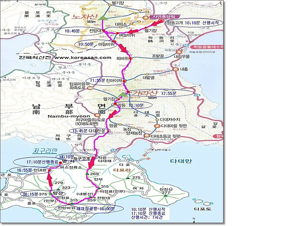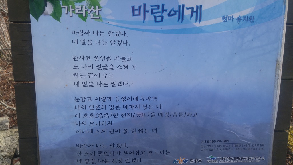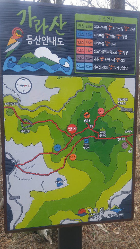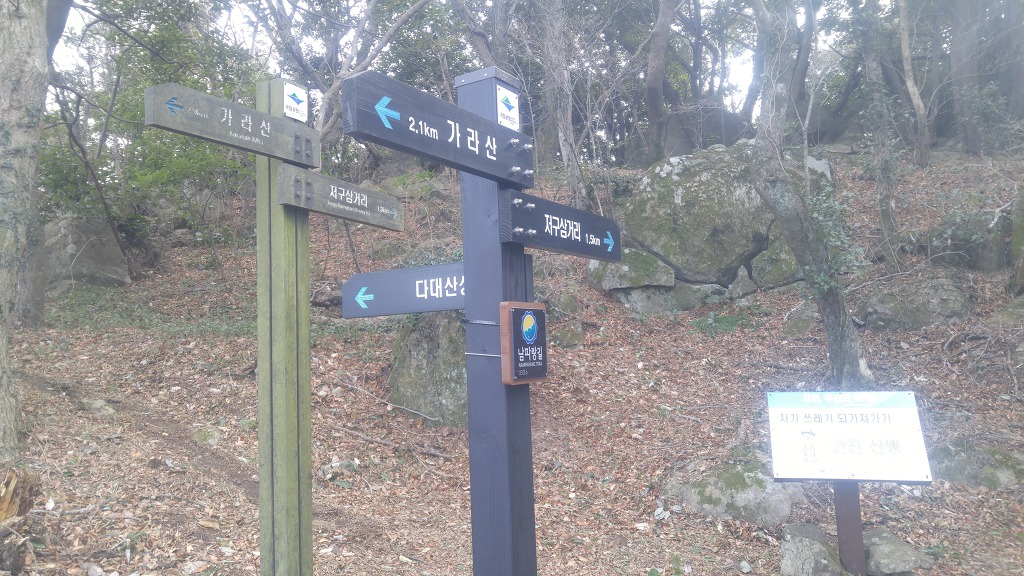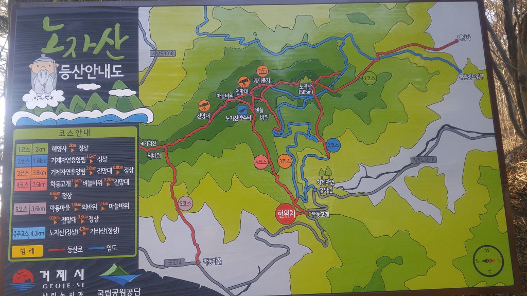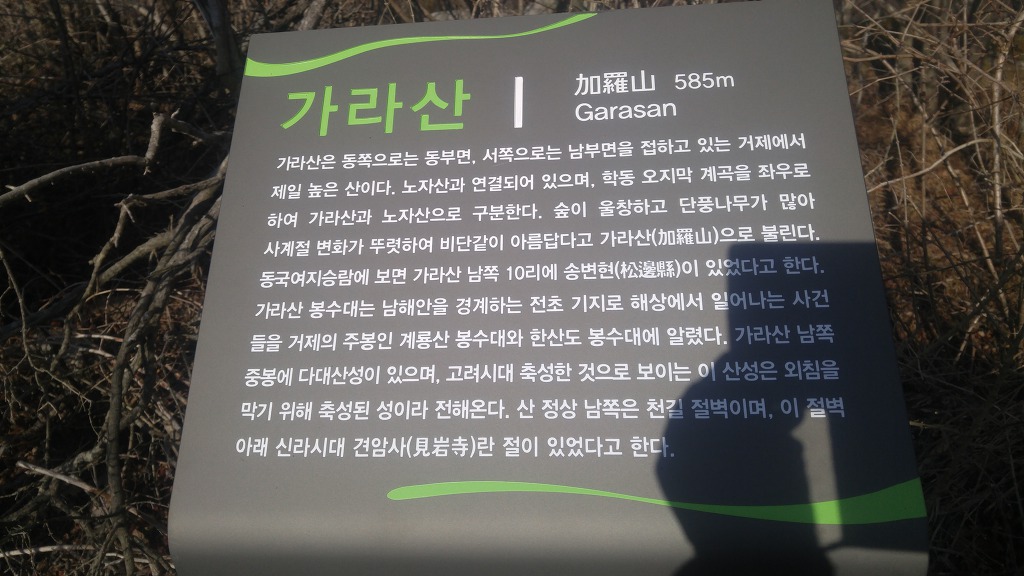 01. 산행기점 : 경남 거제시 동부면 학동고개 02. 산행종점 : 경남 거제시 남부면 명사마을 03. 산행일자 : 2020년 01월 09일(목) 04. 산행날씨 : 맑음 05. 산행지도 06. 산행코스 : 학동고개--->노자산--->가라산--->다대산성--->저구삼거리--->대봉산--->망산--->명사마을 07. 산행거리 및 시간 : 17k 내외, 8시간(중식포함) 08. 차량회수 : 명사마을에서 학동고개로 원점회귀하는데 어려움이 있습니다. 택시를 부릅니다. 010-8777-4051로 연락하세요. 09. 산행소감 : 내평생 종주라는 이름으로 산을 오른 것은 하나는 영남알프스이고 다른 하는 오늘 갈 거제지맥입니다. 거제지맥은 보통 4구간으로 이루어져있는데 오늘은 마지막 구간으로 학동고개에서 명사마을까지 약 17k 정도를 가야합니다. 학동고개 공터에 차를 세워놓고 시계를 보니 9시 10분입니다. 아침에 무슨 인적이 있을까마는 공사를 하는지 소리가 들립니다. 싸늘한 바람을 맞으며 호기심 반, 우려 반의 마음을 갖고 오릅니다. 호기심 반이란 전에 본 산과는 얼마나 달라졌을까 하는 마음이고 우려 반은 너무 긴 코스이니 무릎은 견딜지에 대한 고민입니다. 다른 봉우리는 크게 달라지지 않았는데 노자산은 천지개벽 그 자체였습니다. 정상부에 건설 중인 케이블카 공사로 인해 없던 길도 새로 나고 우람한 나무들도 잘려나갔습니다. 케이블카 개통으로 관광수입이 들어오는 것은 짧게 계산한 것이고 길게 보면 자연경관 훼손에서오는 피해는 더 클 것입니다. 마치 새만금 사업처럼...내 마음에 생채기가 난 것처럼 후회막급이었습니다. 차라리 옛날 그 노자산만 기억하고 있을 것을...마치 차마 보지않아야 할 곳을 본 것 처럼...그나마 노자산 정상에 서니 천하가 보이고 지금까지 거치며 온 노정을 굽어보았습니다. 몸집 좋은 가라산으로 가는 여정은 안부처럼 부드럽고 곳곳에 전망대가 있으니 지루하지 않았습니다. 오히려 봉수대가 있는 가라산 정상은 펑펑한 곳이어서 멀리 시야가 터이지 않았습니다. 그래서 빨리 가라!는 뜻으로 여기고 망산으로 가는 발길을 재촉합니다. 전에 올랐던 망산은 내 마음 속 어디에도 남아있지 않고 그 전의 뽀족한 봉우리인 대봉산이 망산인 걸로 착각하였습니다. 즉, 대봉산은 기억나는데 정작 망산은 기억나지 않아 잊을 忘자 忘山으로 불러야겠습니다. 그 때 대봉산 정상에서 오손도손 충무김밥과 함께 막걸리를 기울이던 산행동지들 생각도 납니다. 그 뒤로 생각나지 않는 것은 막걸리 탓인가요. 아무튼 대봉산에서 망산까지의 여정은 좋은 경치로 충만했는데 내 발걸음은 대단히 무디어졌습니다. 망산 정상에서 본 대병도, 가왕도, 매물도 등이 부서지는 물결에 이리저리 요동치는 듯 지는 햇빛에 붉게 물드니 오늘 여정도 종말을 향해 치닫고 있습니다. 명사마을에 내려 동부면 개인택시에 전화해 명사마을에서 학동고개까지 간다고 하였더니 다짜고짜로 "25000원 이하로는 갈 수 없다"고 못을 박았습니다. 그것도 큰 못을...타협의 여지가 없다고 판단한 호산광인은 지난주 이용했던 분에게 연락했더니 "잠깐 기다리세요"하더니 곧 전화를 주면서 "명사초등 정문에 계시면 차가 갈 겁니다"하였지요. 아닌게 아니라 10분이 안되어 차가 당도하였습니다. 구관이 명관입니다. 학동고개 샘터가 있습니다 노자산으로 갑니다. 임도가 새로 ... 우측이 노자산 노자산 정상에서 본 케이블카가 건설될 곳 신선이 산다는 노자산을 이렇게 훼손해도 되는지... 우측 산은 중계탑이 있는 희망봉 중간 좌측으로는 구천댐이 보이고 멀리 옥녀봉도 거제면과 둔덕면 방향. 사진으로는 산방산이 보이지 않네요 동부면 율포만 멀리 망산이 보입니다 노자산에서 가라산으로 가야죠 시멘트 고개로 올라와 저기 보이는 산길로 올라갑니다 3층 정자에 올라갑니다 정자에서 본 노자산 멀리 옥녀봉 가라산 바로 앞은 마늘바위 저구리만 전망대에 올라가 봅니다 마늘바위 능선 좌측 선자산 학동. 멀리 공곶이도... 바람의 언덕과 우제봉 가라산 가라산 입구에서 뒤돌아본 마을바위 이게 매바위 가라산의 씩씩함 매바위와 해금강 뫼바위 비자나무인듯 노자산 멀리 산방산 홍포고개 끝자락 167봉이 바닷가에 ... 망등에서 포토존으로 갑니다 가운데 멀리가 대봉산이고 우측이 망산 다대만 아직 걸어야할 봉우리가 많습니다 좌측의 봉우리는 천장산 뒤돌아본 가라산 다대산성 방향으로 산성 가라산 작은 다대재 옛날의 자연과는 많이 다릅니다 저구삼거리로 갑니다 268봉에서 본 가라산 다대만 대봉산 천장산 대봉산에서 본 가라산 여기서 옹기종기 김밥먹던 시절이 ... 우측 멀리 가왕도. 우측은 소대병도 좌측은 대대병도 이제 망산이 시야에 ... 거북이 모습의 가왕도 대병도 멀리 매물도가 보였는데... 가왕도 거북이가 물에 목을 적십니다 망산 요철이 심합니다 대봉산과 천장산이 쌍둥이 모습을 하고 있습니다 멀리 가라산과 노자산 능선 근포같네요 명사해수욕장이 보입니다 장사도가 뱀처럼 길게 뻗어있습니다. 좌측 멀리 매물도가 희미합니다 명사마을 명사해수욕장 뒤로 436봉이 보입니다. 오후 5시에 명사마을에서 택시를 기다립니다 |