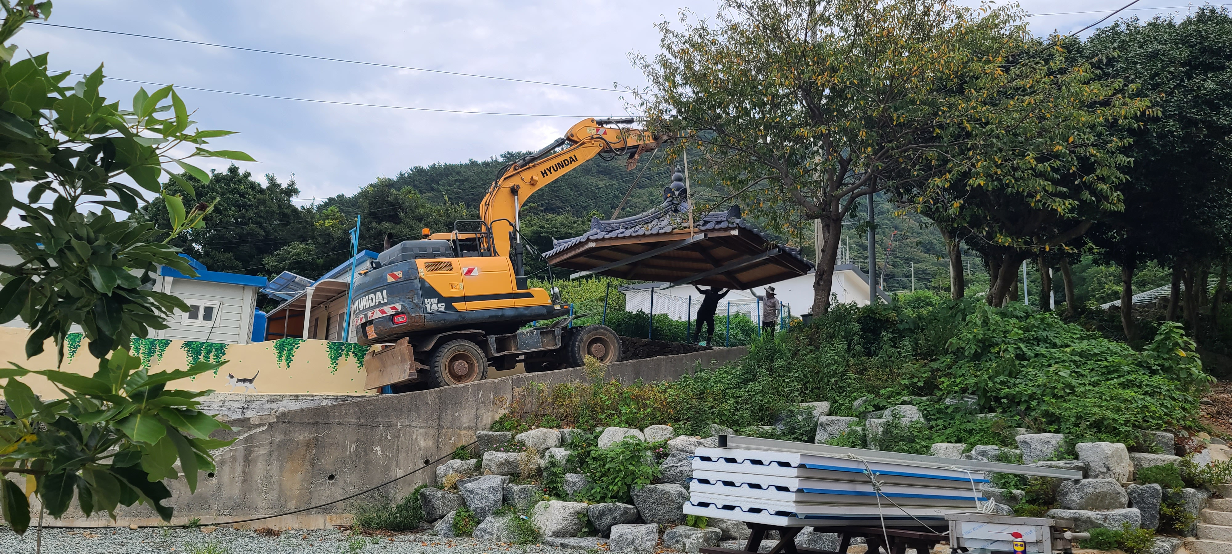 마을편의점에서 우선 캔맥 한통을 마시면서 에어콘 바람을 쒸운다. 가지도 않는 시간이다. 저 포클레인이 아침에 마당에 있던 정자 지붕을 마을 뒤쪽으로 옮기는 공사나 보면서 시간을 보내지만 저 나무때문에 더 진행하지 못하고...제일 좋은 방법은 여기 북구마을에서 다시 설풍-청석-남구마을까지 걷는 것이다. 남구마을에서 배를 타는 것이다. 그래도 시간은 충분할 것이다.