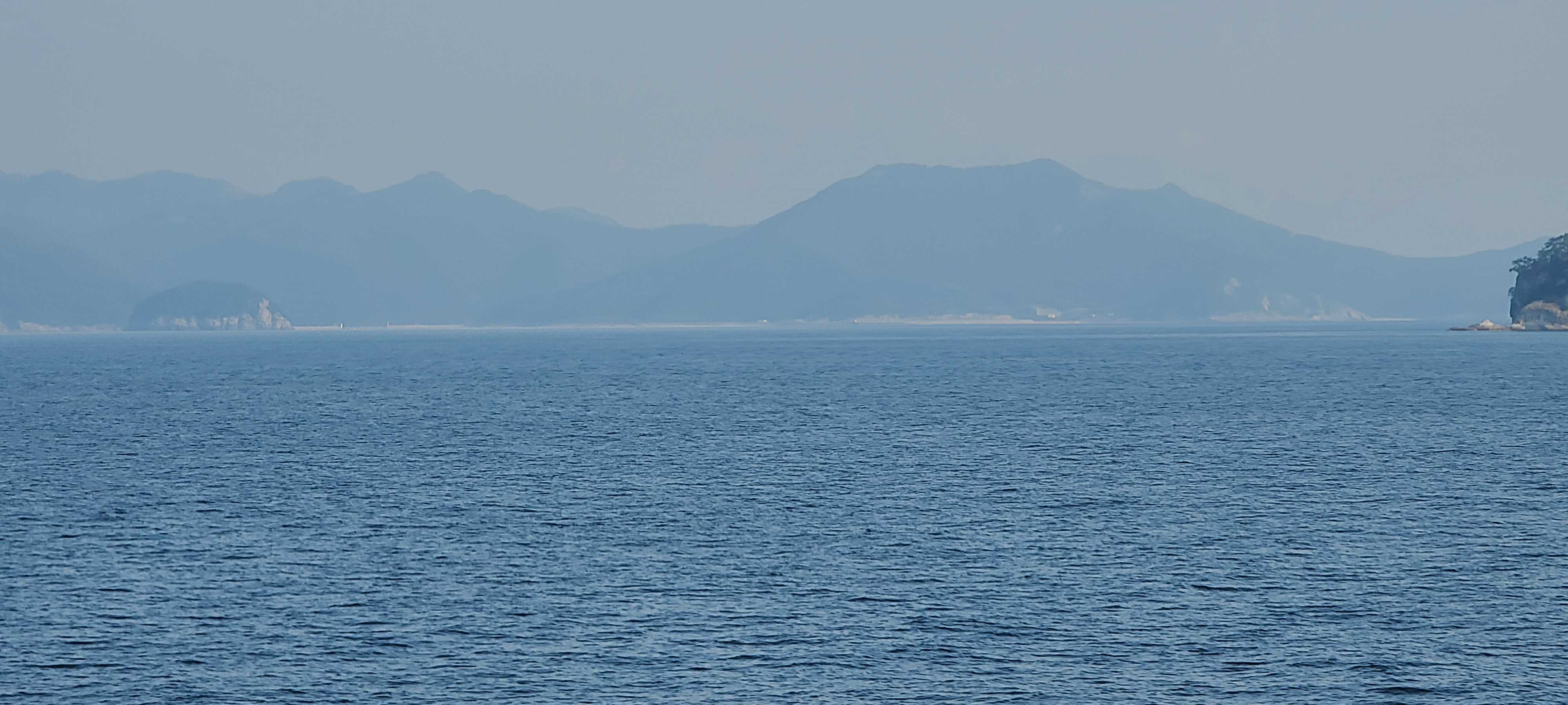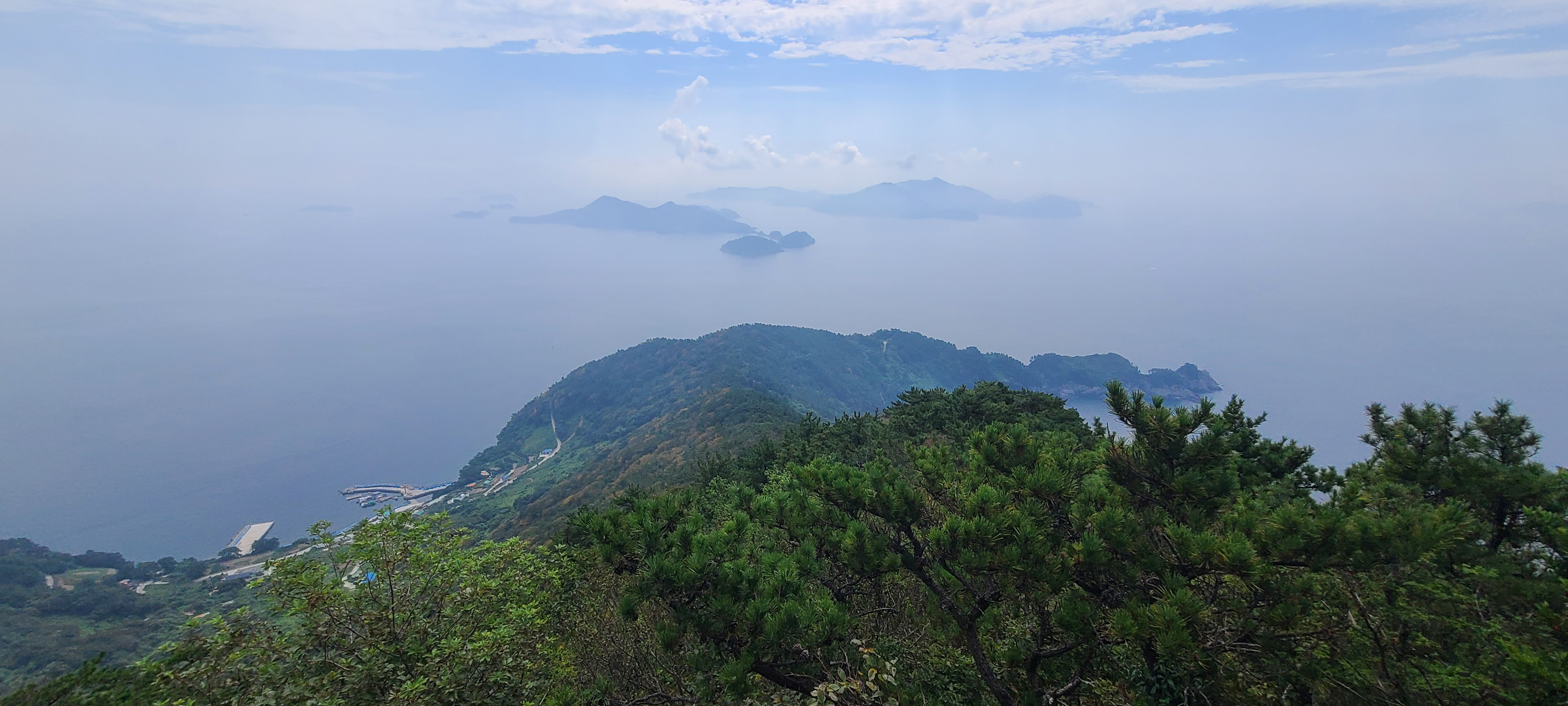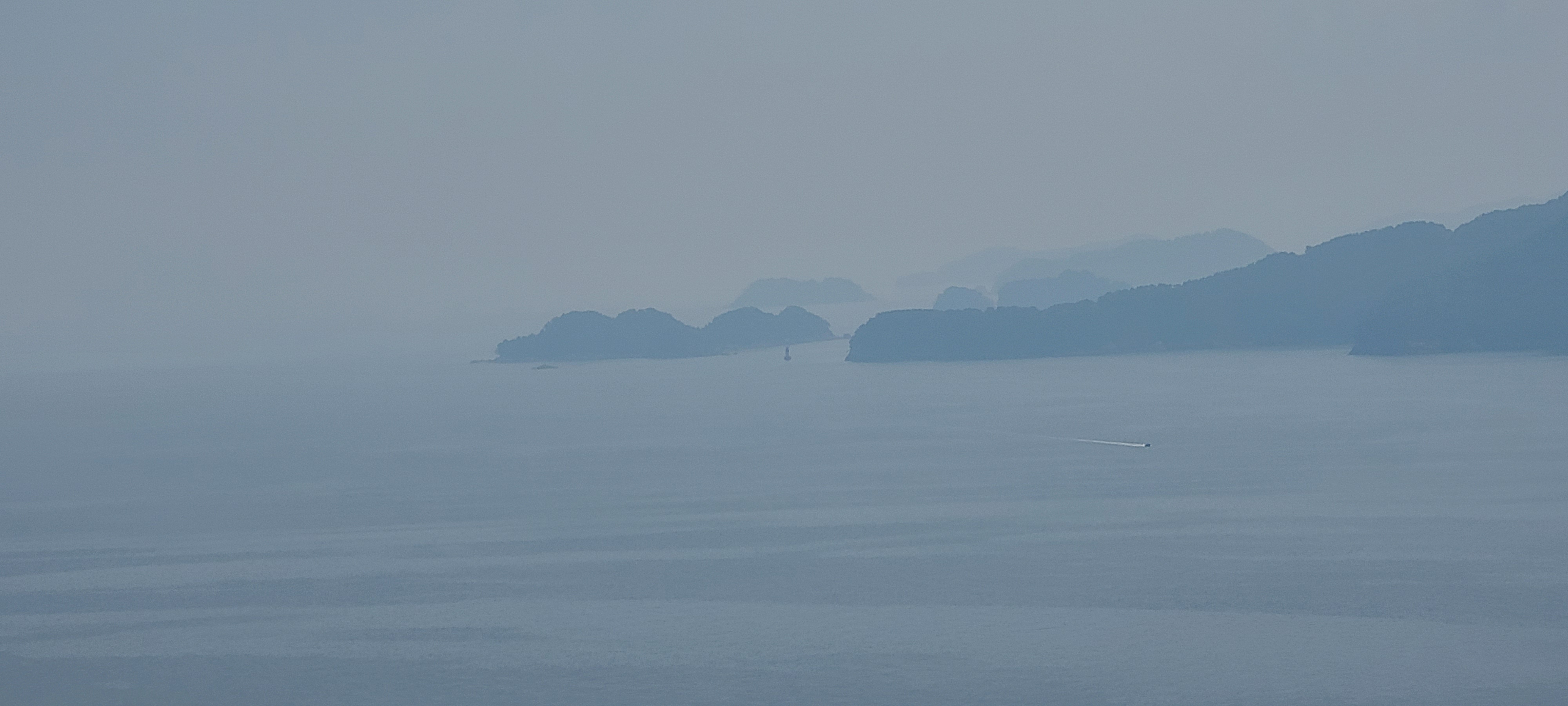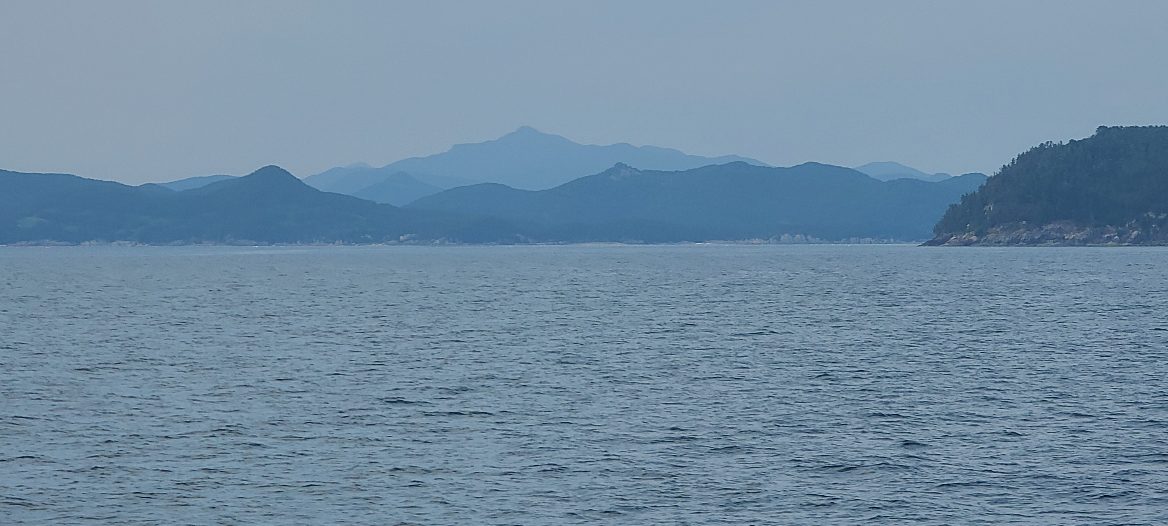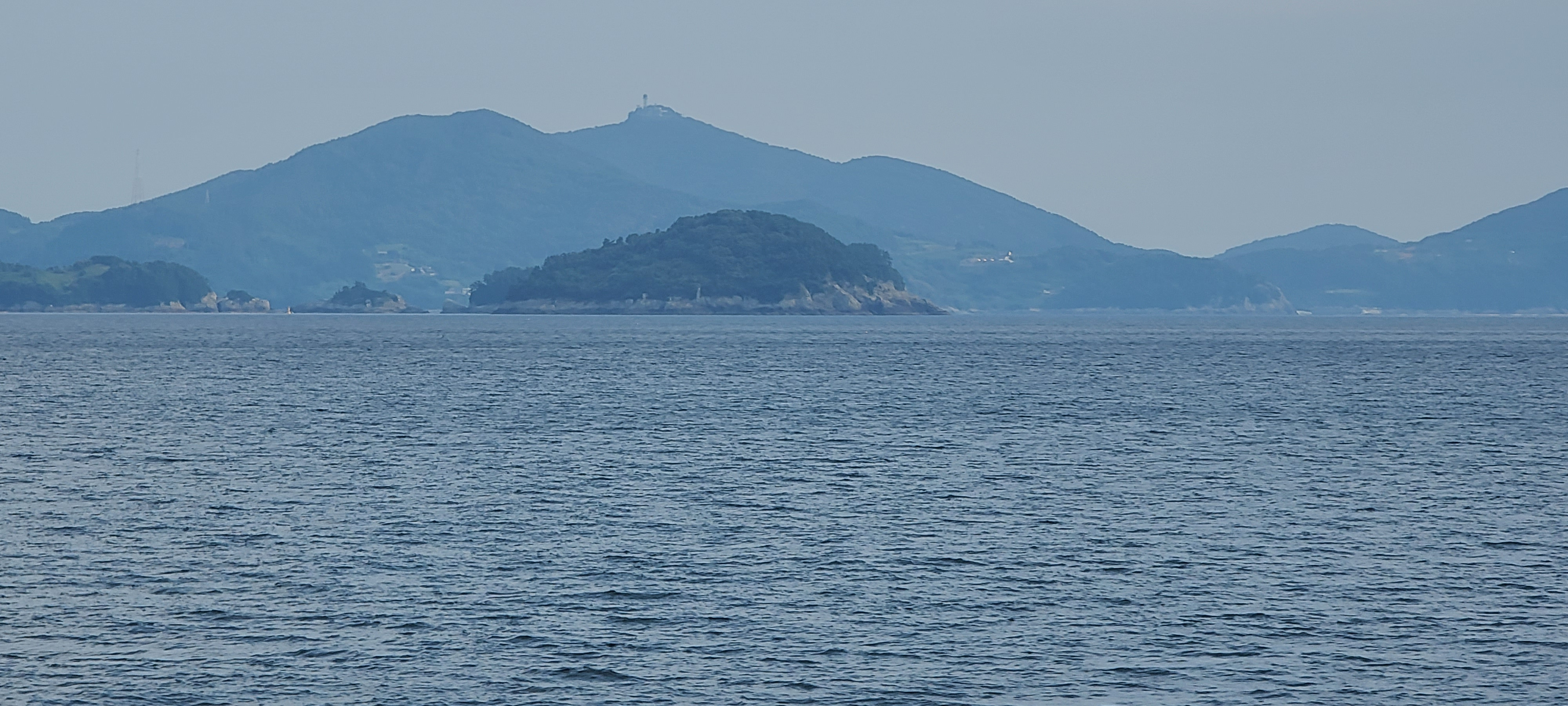 욕지도가 보이고 그 앞이 노대도이고 그 앞 비교적 선명한 산은 거칠리도이다.