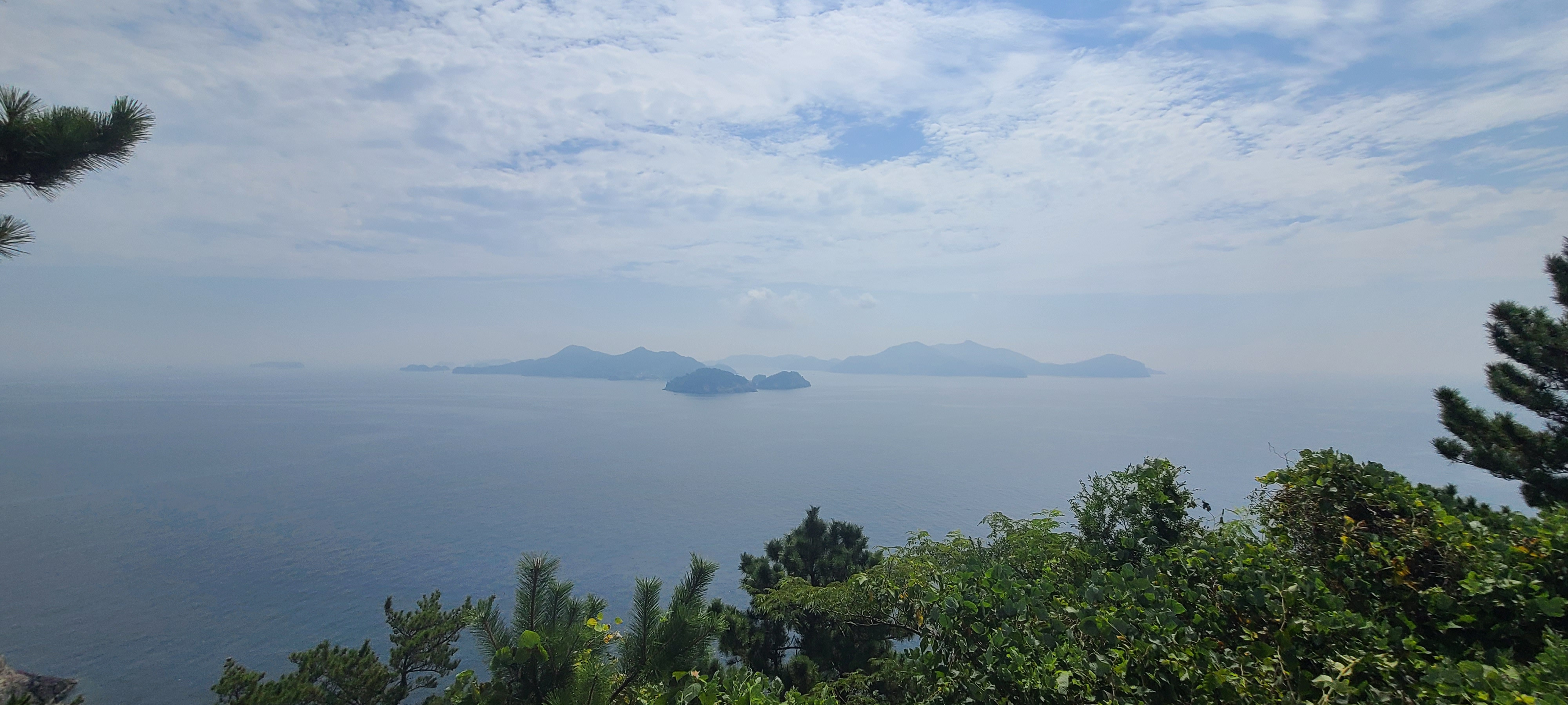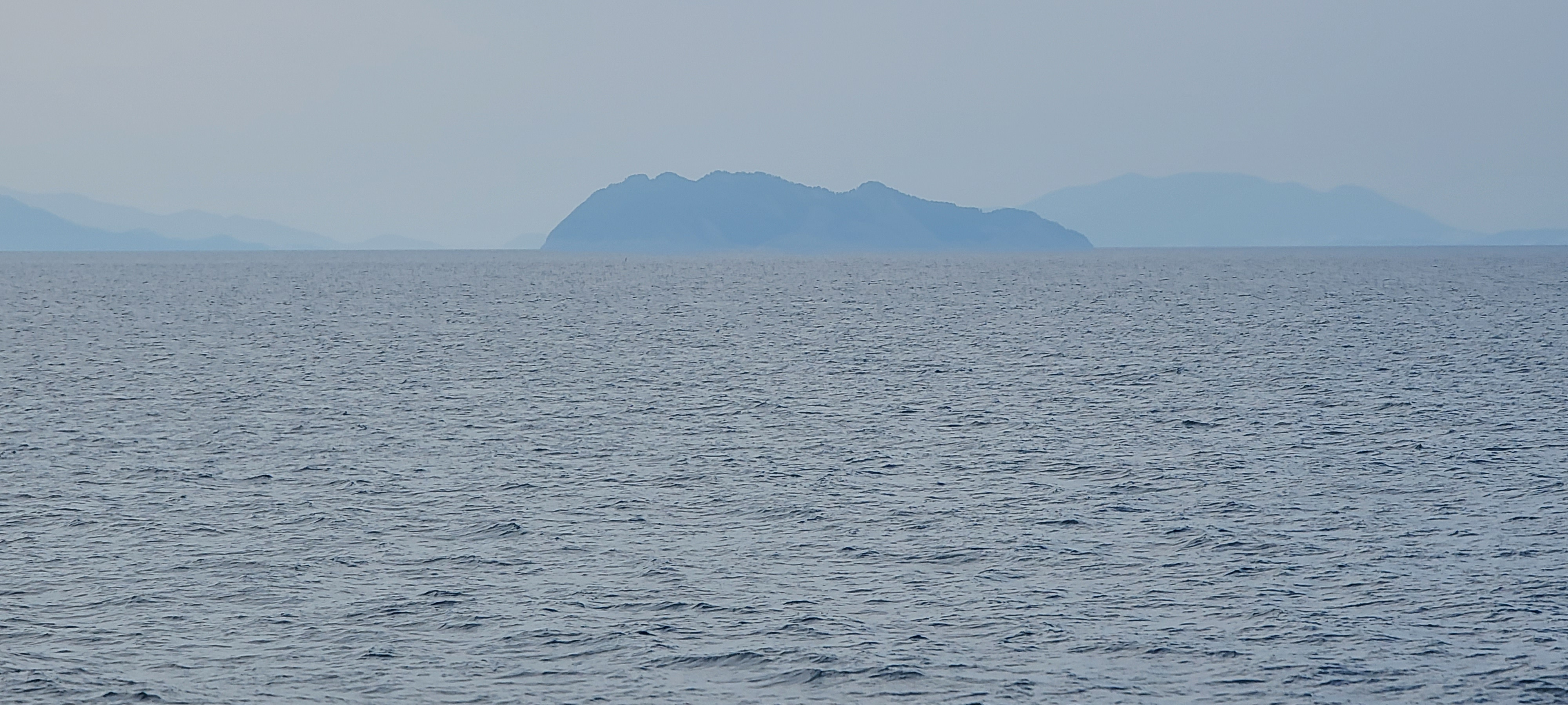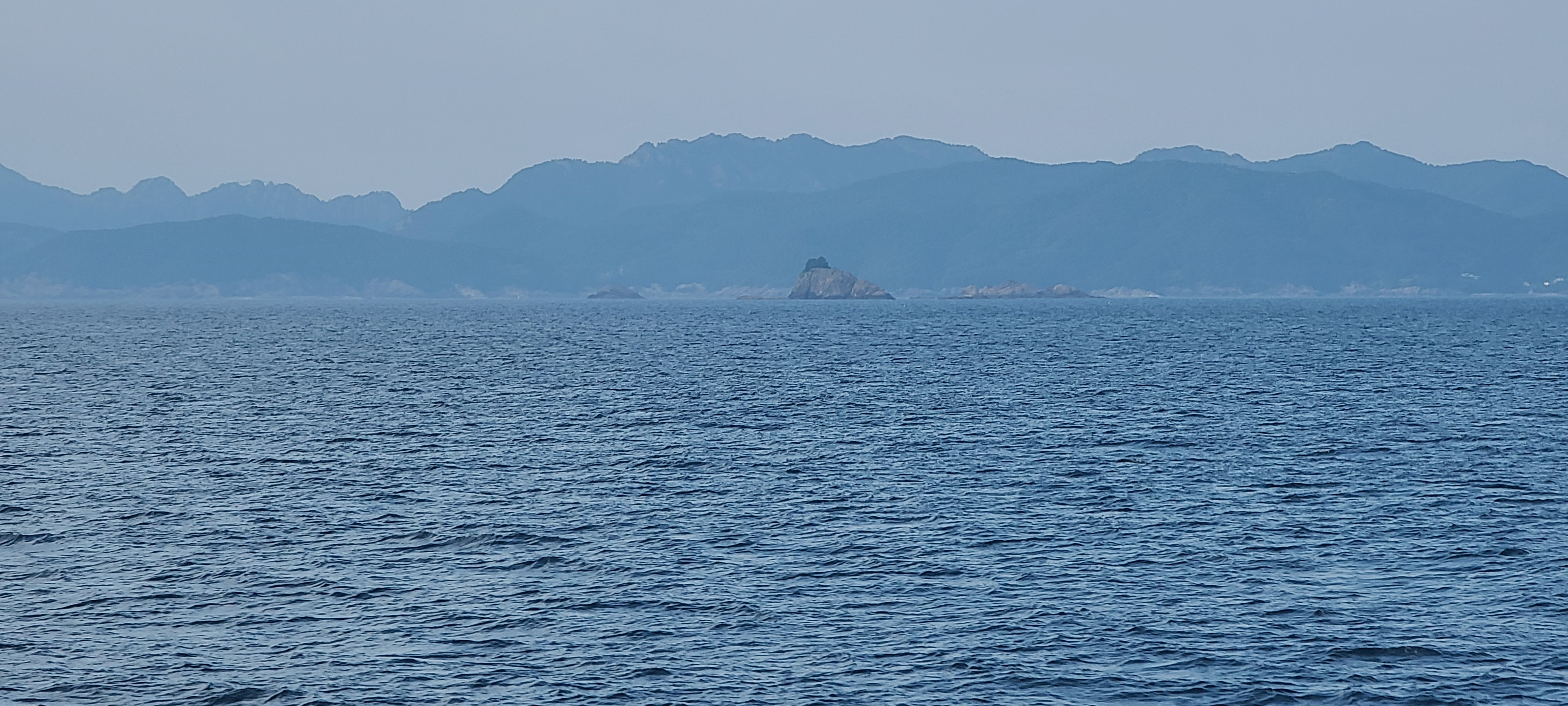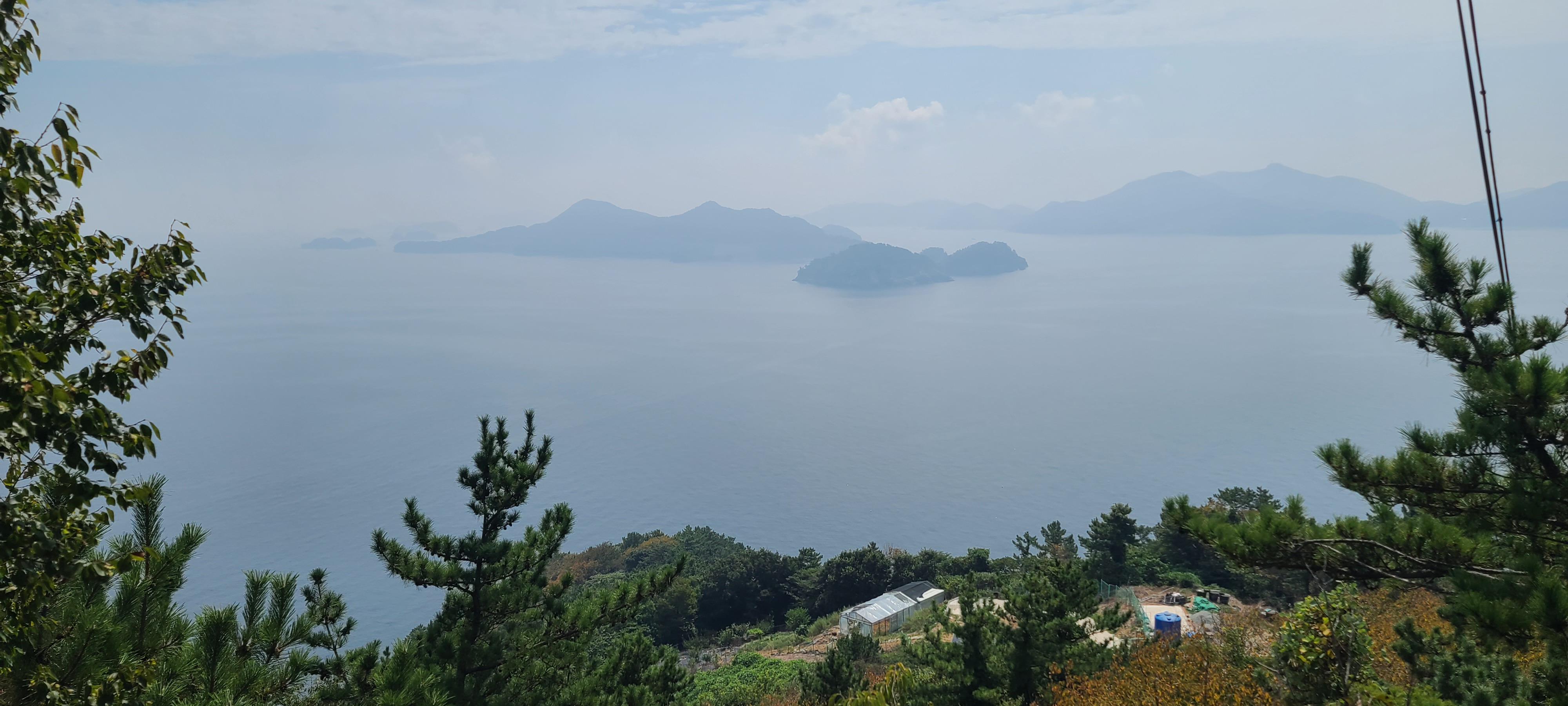 욕지도가 보이고 그 앞이 노대도이고 그 앞 비교적 선명한 산은 거칠리도이다.