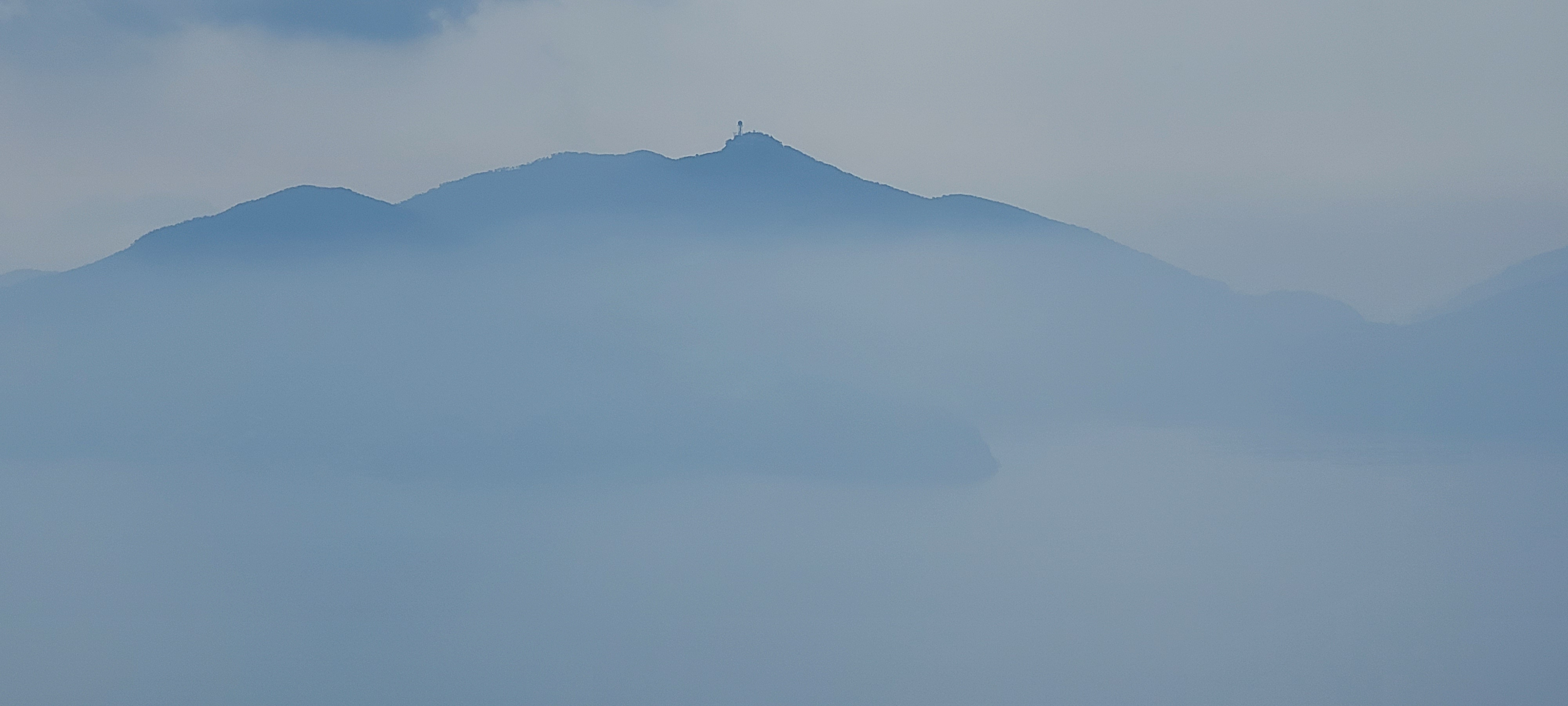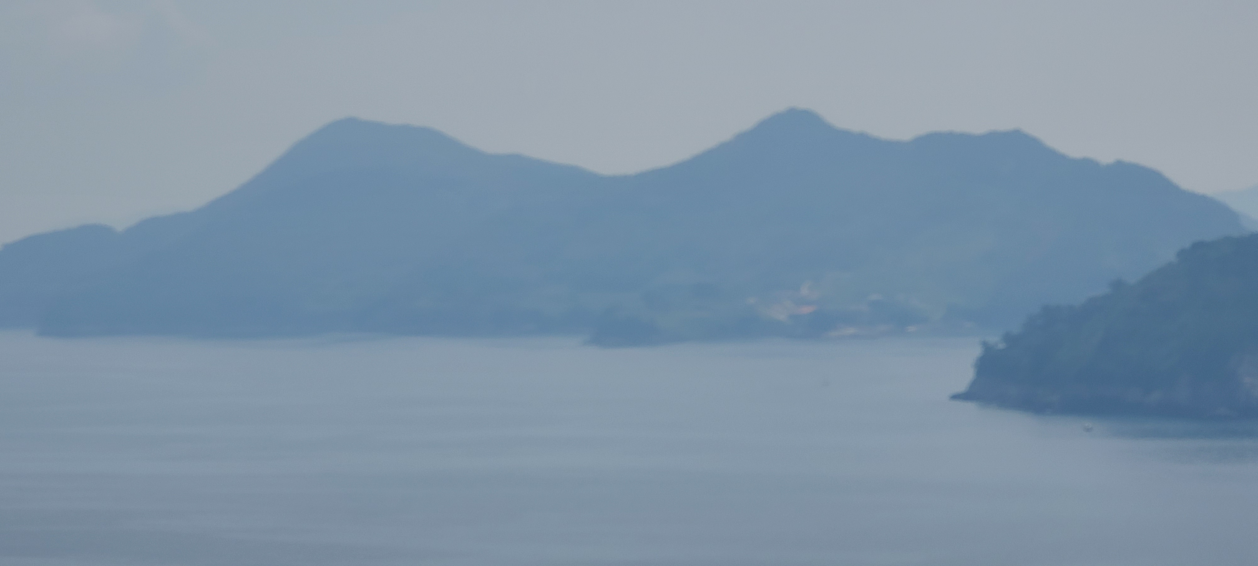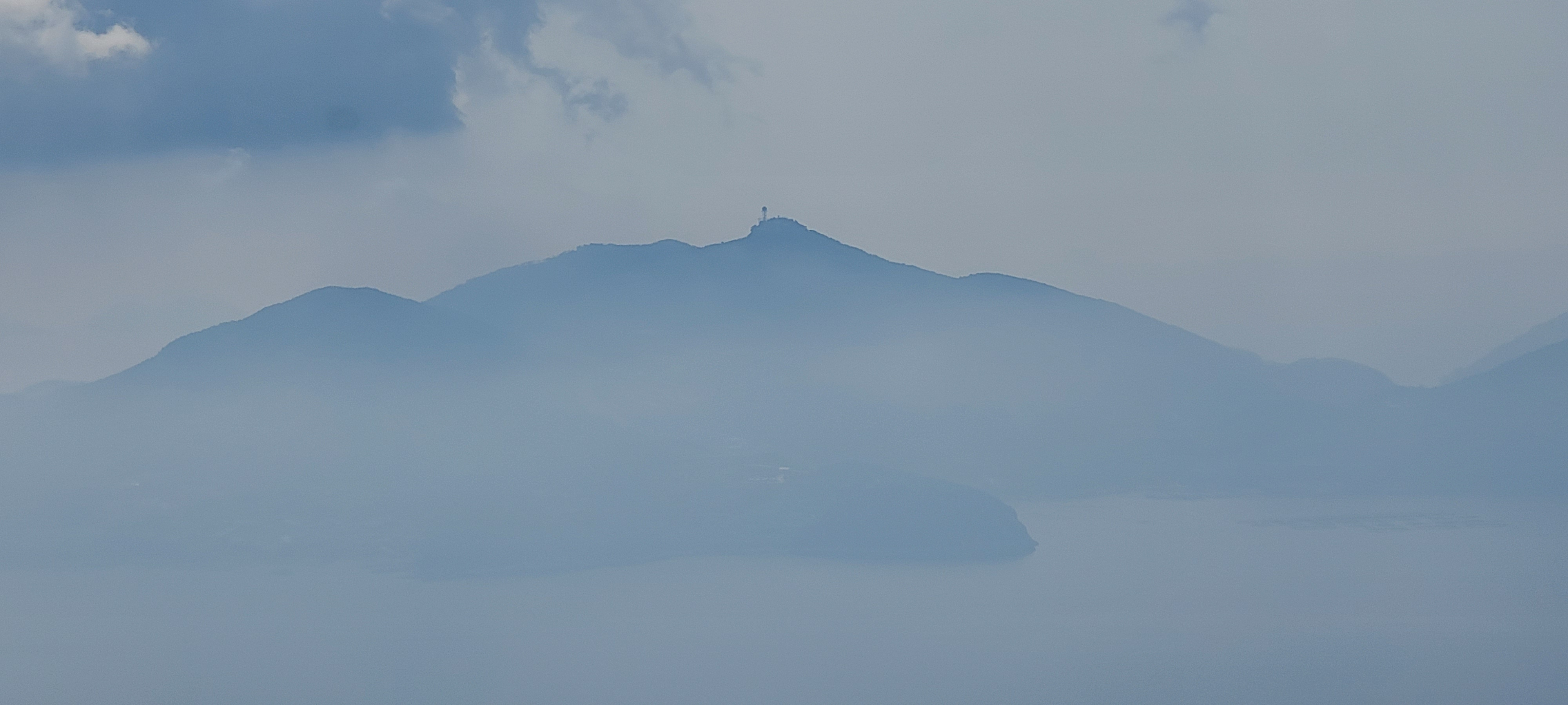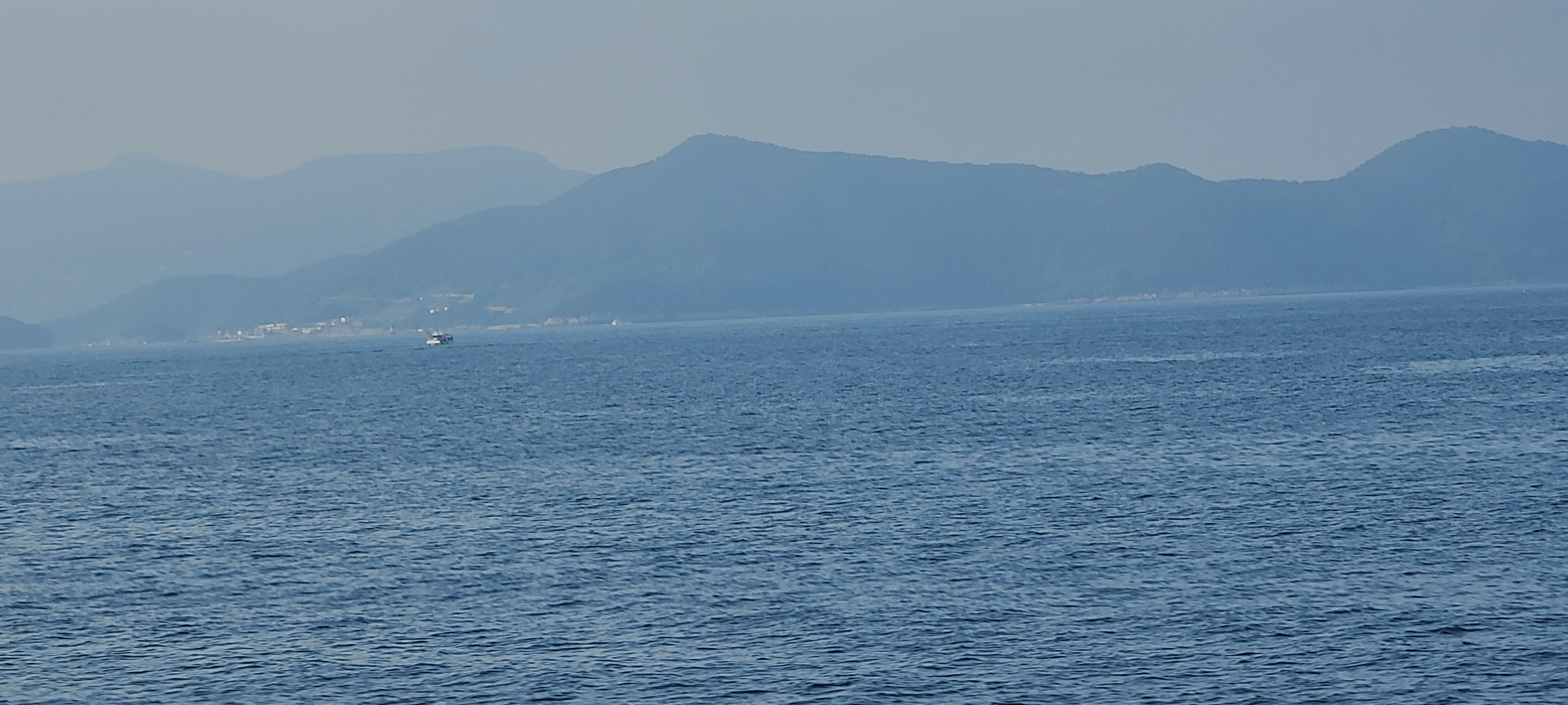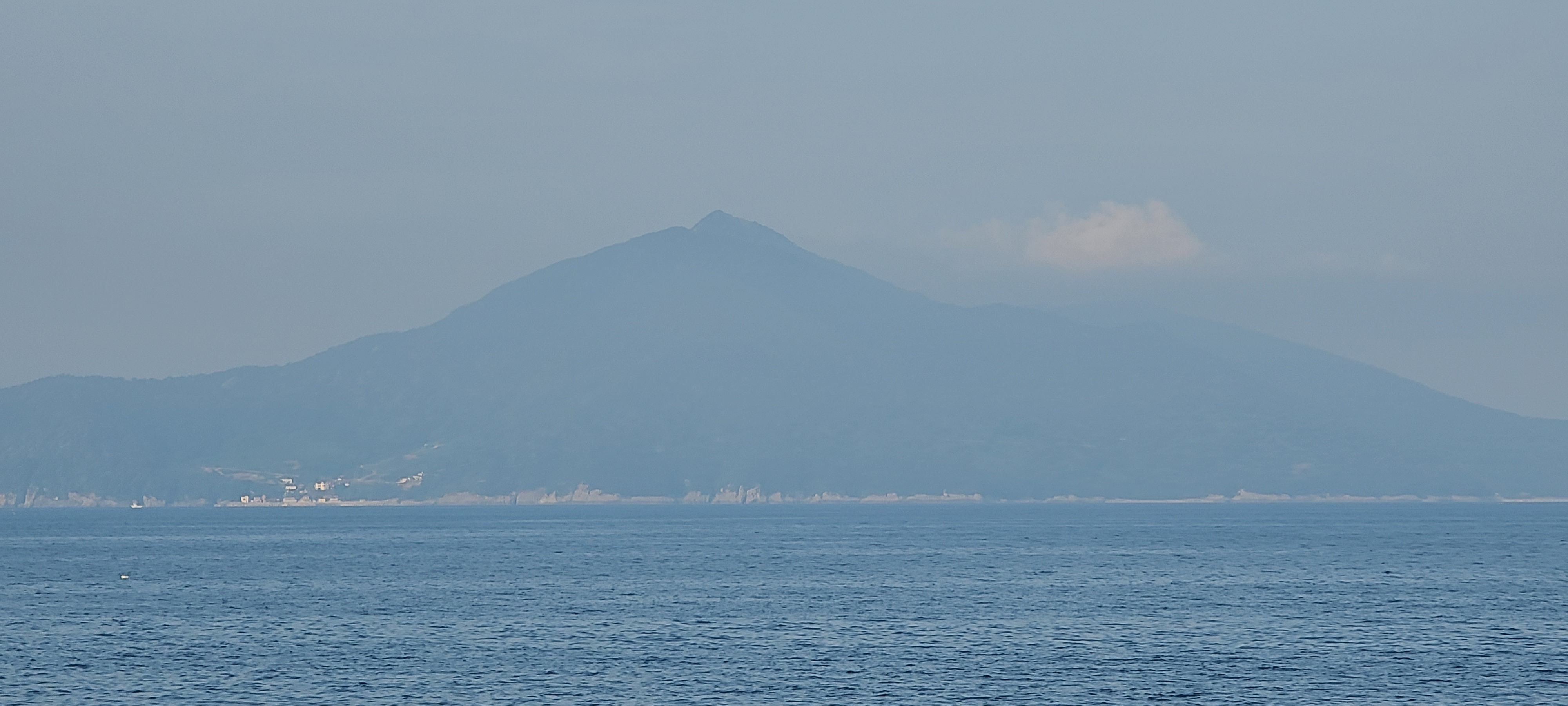 욕지도가 보이고 그 앞이 노대도이고 그 앞 비교적 선명한 산은 거칠리도이다.