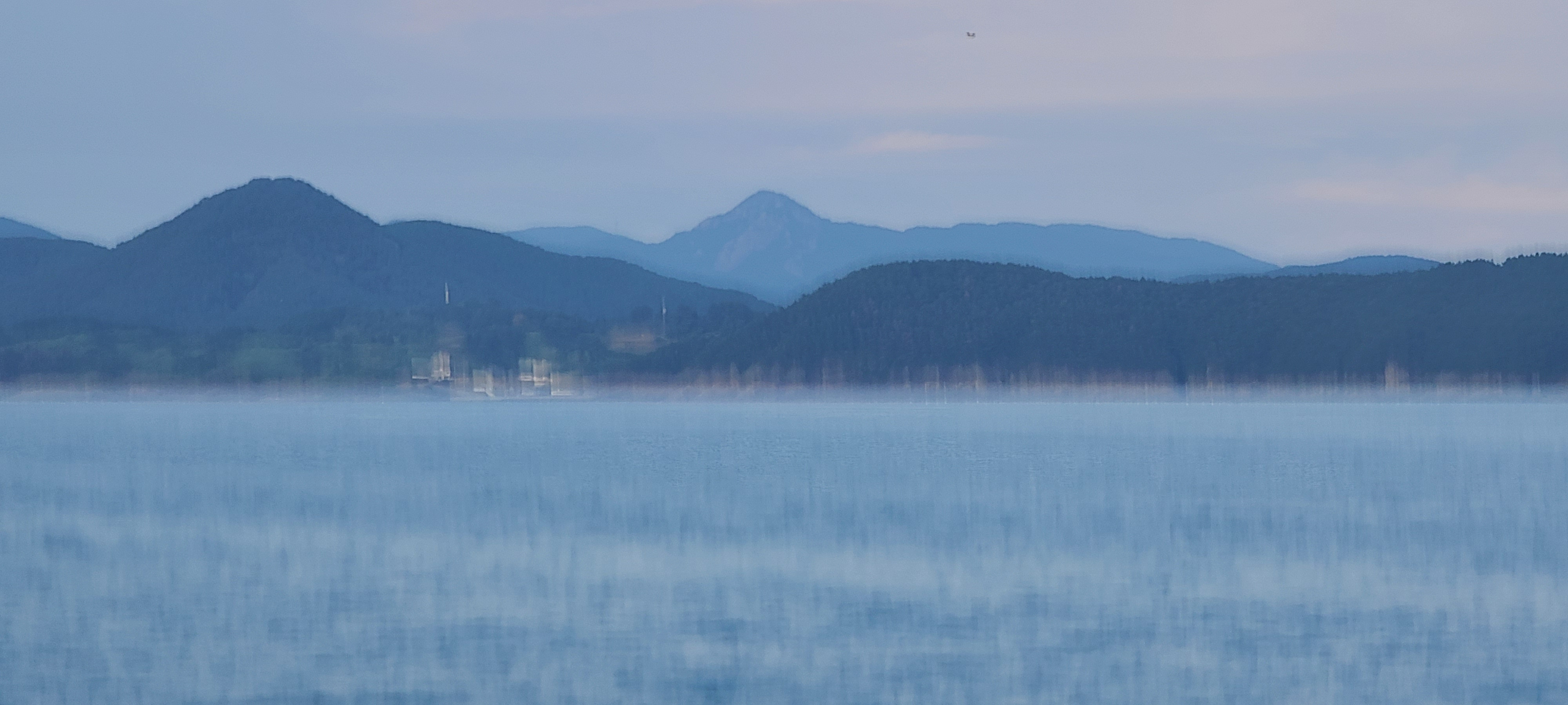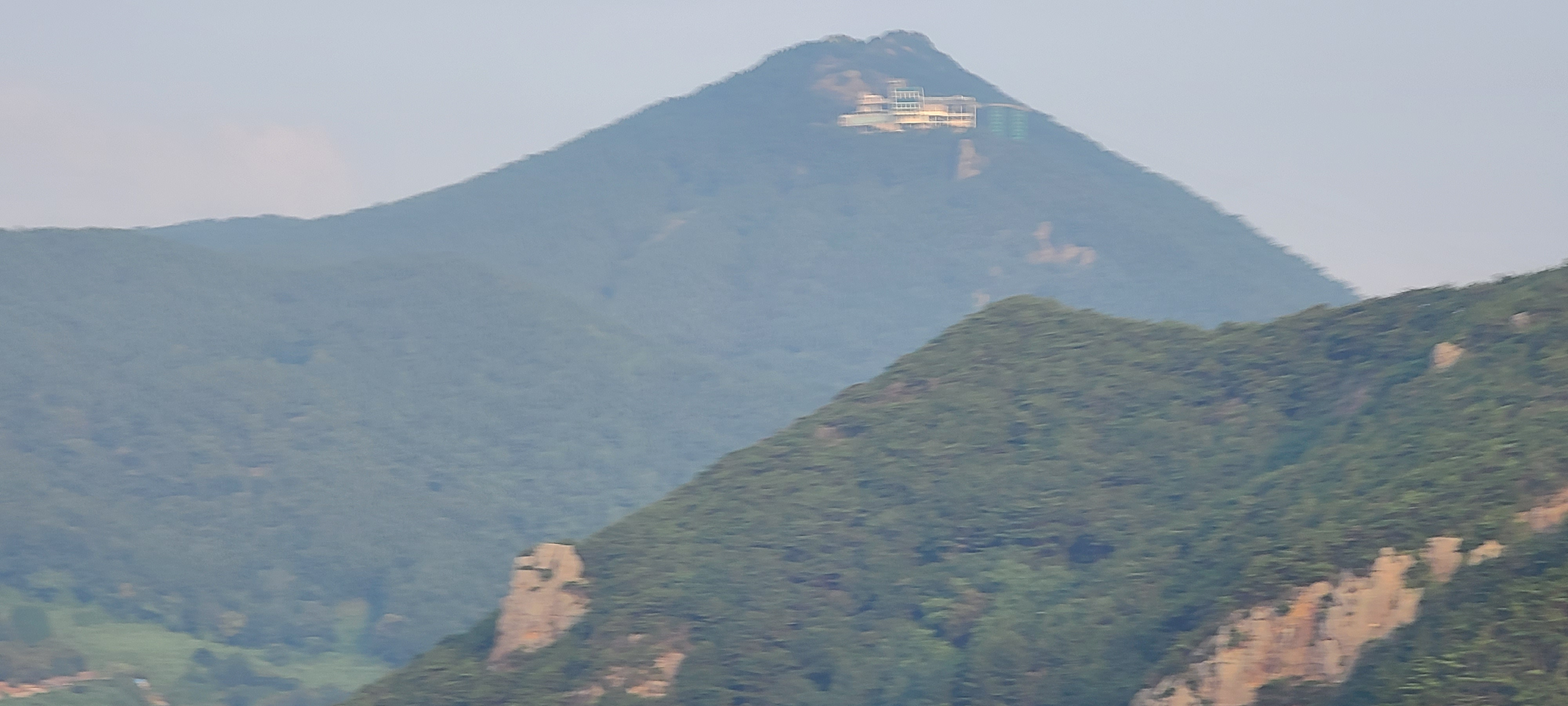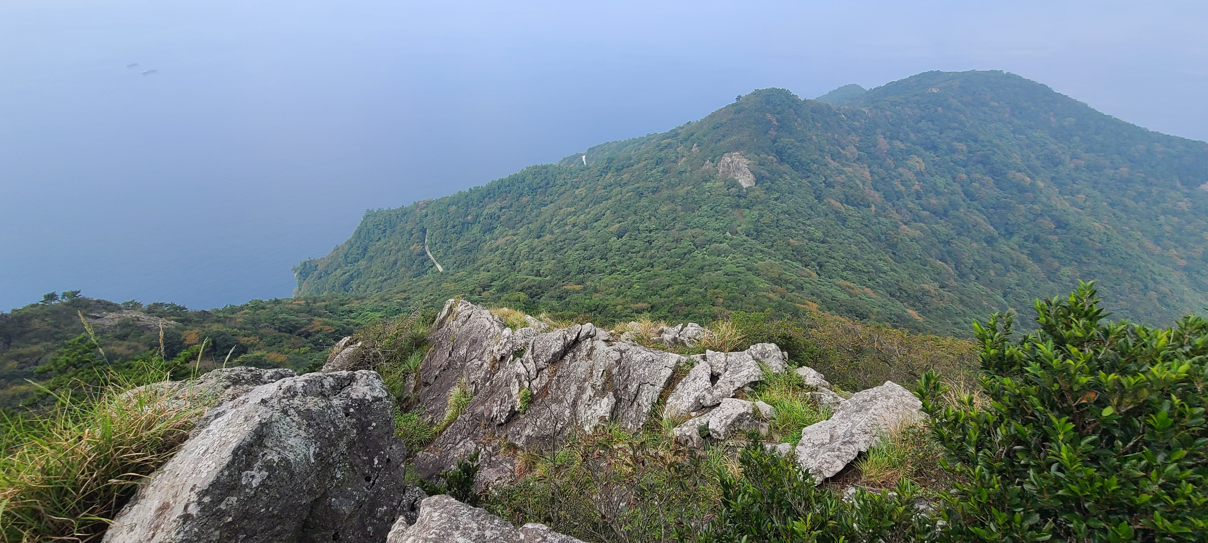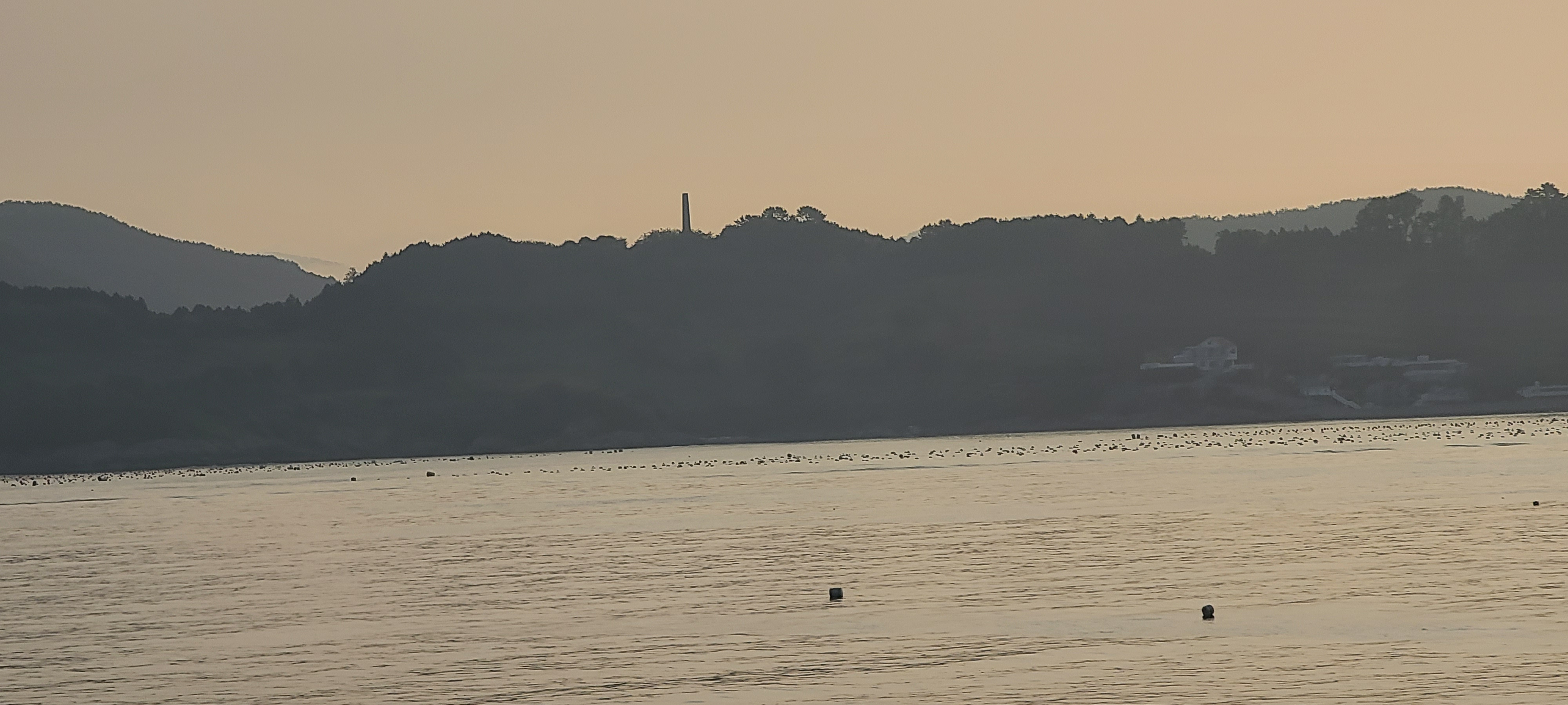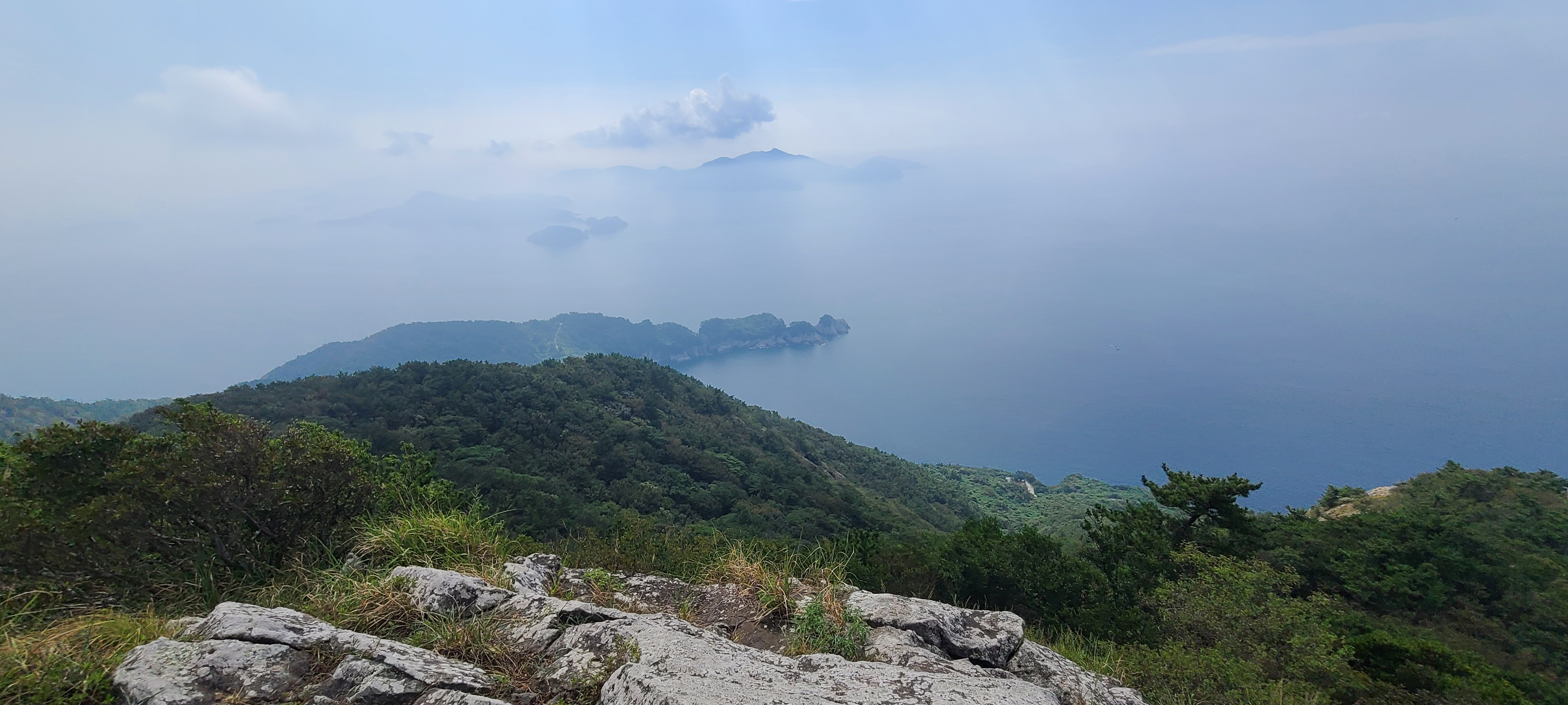 욕지도가 보이고 그 앞이 노대도이고 그 앞 비교적 선명한 산은 거칠리도이다.