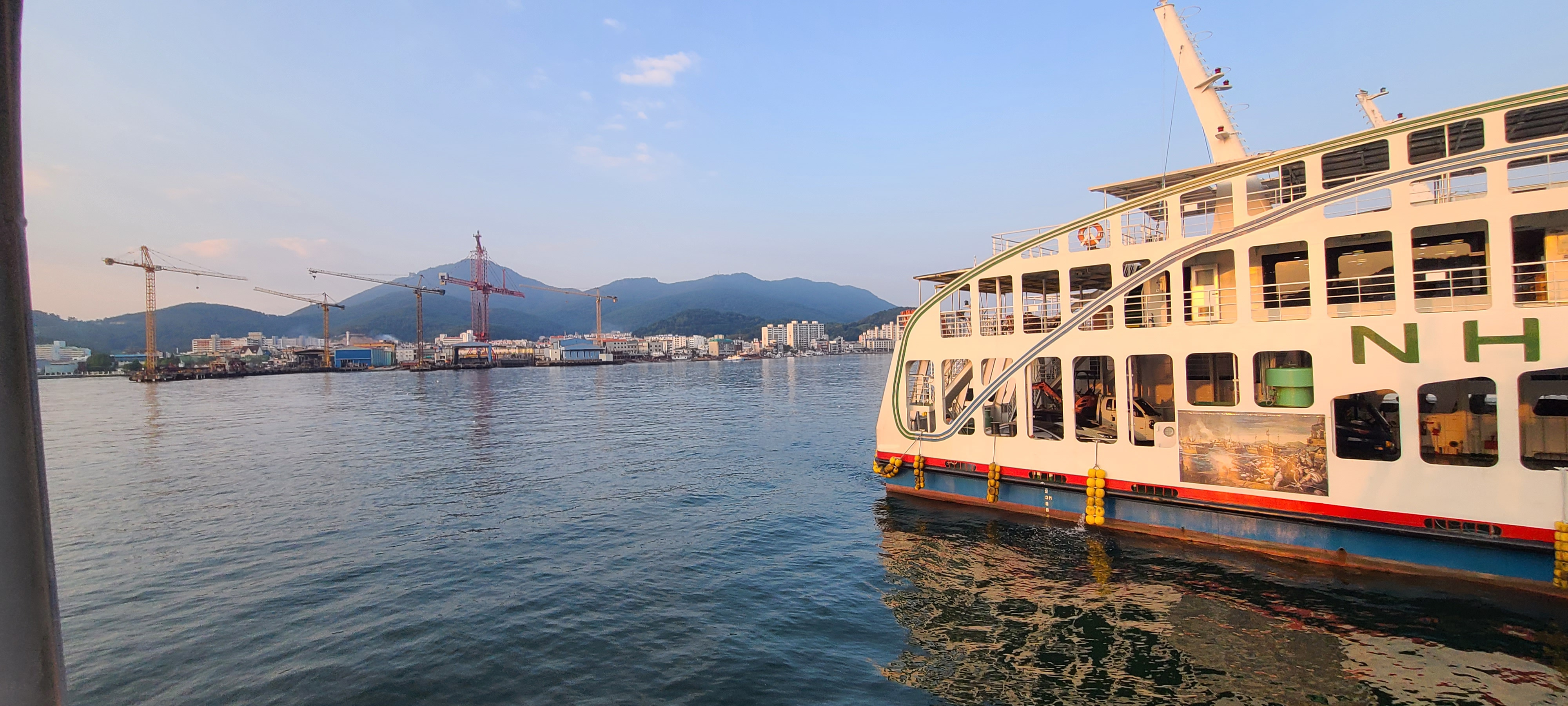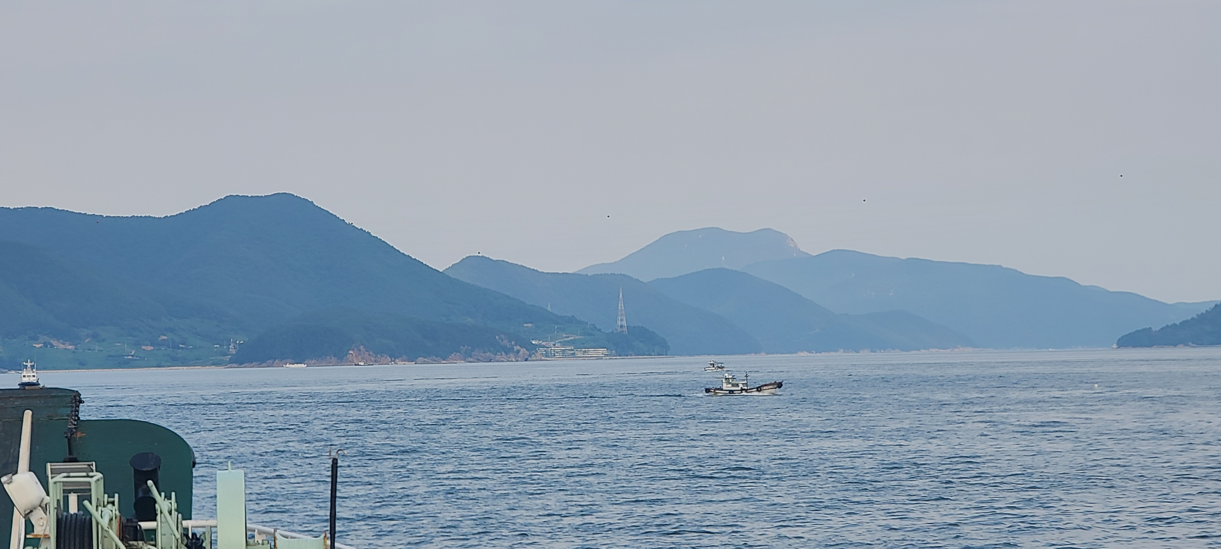 우측으로 통영 미륵산이 보인다. 농협도 배를 운항하는가봐