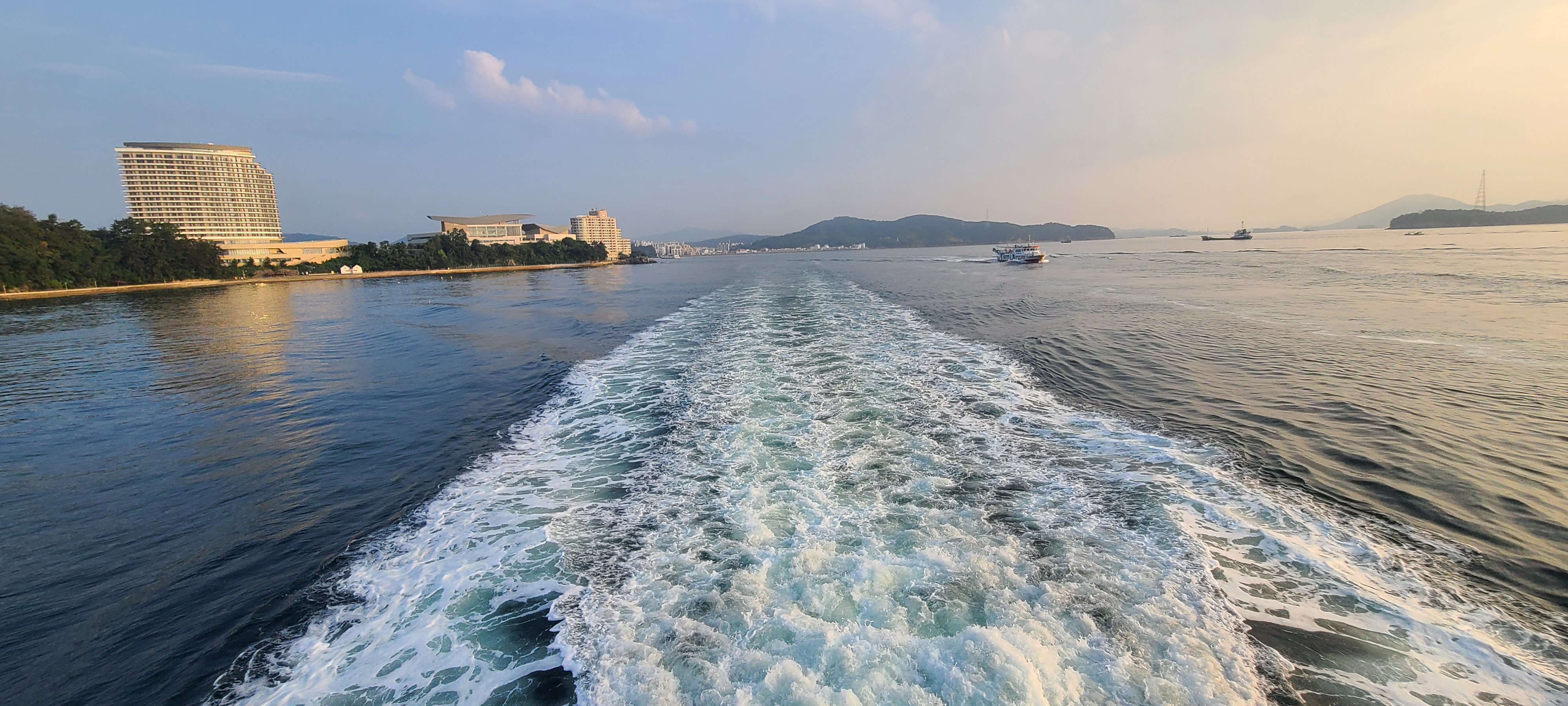 통영항을 뒤로 하고 하얀포말을 일으키며 전진한다.