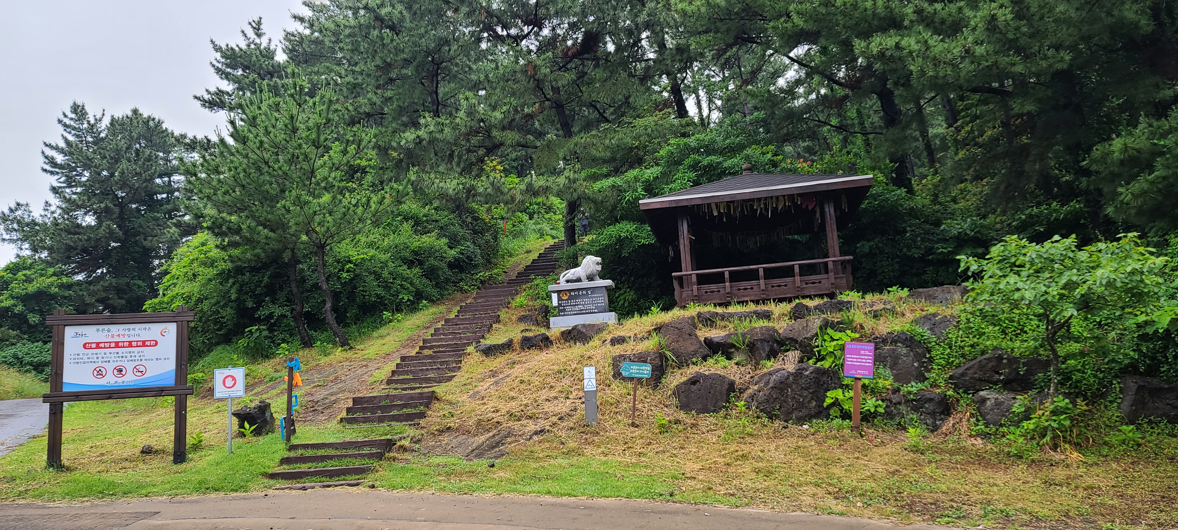 1k쯤 올라와서 이제 두산봉(말미오름과 알오름)으로 올라간다. 정자엔 전국에서 온 올레꾼들의 리본이 빨레처럼 걸려있다.