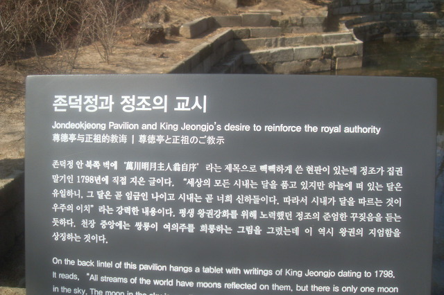 존덕정 안 북쪽 벽에는 ‘萬川明月主人翁自序’라는 제목으로 빽빽하게 쓴 현판이 걸려 있는데 정조가 집권 말기인 1798년에 직접 지은 글이다. “세상의 모든 시내는 달을 품고 있지만 하늘에 떠 있는 달은 유일하니, 그 달은 곧 임금인 나이고 시내는 곧 너희 신하들이다. 따라서 시내가 달을 따르는 것이 우주의 이치”라는 강력한 내용이다. 평생 왕권 강화를 위해 노력했던 정조의 준엄한 꾸짖음을 듣는 듯하다. 천장 중앙에는 쌍용이 여의주를 희롱하는 그림을 그렸는데 이 역시 왕권의 지엄함을 상징하는 것이다. <출처:문화재청>