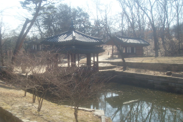 반월지라는 작은 연못과 반도지 사이에 있는 존덕정. 이곳에 있는 4개의 정자 중 가장 오래된 것으로 1644년에 세워졌다고 한다. 정자에는 정조가 쓴 글이 새겨진 현판이 걸려 있다.