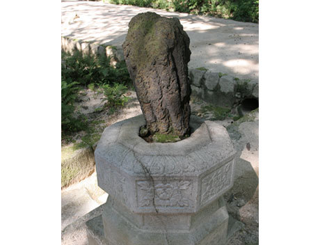 돌다리 앞에 세워져 있는 연잎모양을 하고 있는 석물