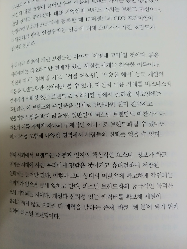 2012년 6월 시작 천권 읽기 904권)쎈 놈 VS 약한 분 (갑과 을, 어떻게 살아야 하는가?) 허은아(기업인) 저 *인상적인 구절: 우리나라 최초의 개인 브랜드는 아마도 ‘이명래 고약’일 것이다. 젊은 세대에게는 생소하지만 연배가 있는 사람들에게는 친숙한 이름이다. ‘성신제 피자’, ‘김찬월 가모’, ‘정철 어학원’, ‘박승철 헤어’등도 개인의 이름을 브랜드화한 것이라고 볼 수 있다. 자신의 이름 자체를 비즈니스와 연계시켜 신뢰성 있는 브랜드로 정착시킨 점에서 놀라운 시도임에는 틀림없다. 이 브랜드의 주인공을 실제로 만난다면 왠지 친숙하고 믿음직한 느낌을 받지 않을까? 일반인의 퍼스널 브랜딩도 마찬가지다. 자신의 이름 자체가 하나의 구체적인 이미지로 브랜드화될 수 있다면 비즈니스를 포함해 다양한 영역에서 사람들의 신뢰를 얻을 수 있다. 현대 사회에서 브랜드는 소통과 인지의 핵심적인 요소다. 정보가 차고 넘치는 시대에 사는 우리에게 명함은 쌓여가고 휴대전화에 저장된 연락처는 늘어만 간다. 이렇다 보니 상대의 머릿속에 확고하게 각인되는 이미지가 없으면 금세 잊히고 만다. 퍼스널 브랜드화의 궁극적인 목적은 오래 기억되는 것이다. 개성과 신뢰성 있는 캐릭터를 확보해 세월이 흘러도 늙지 않고 오히려 더 매력을 발하는 존재, 바로 ‘쎈 분’이 되기 위한 노력이 퍼스널 브랜딩이다.
