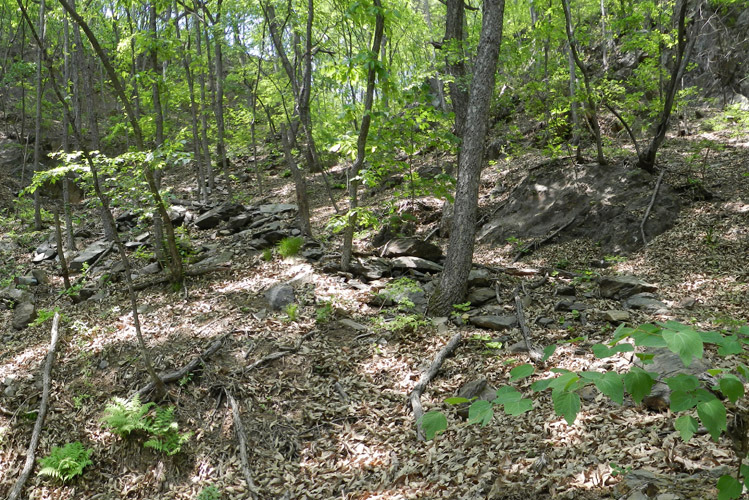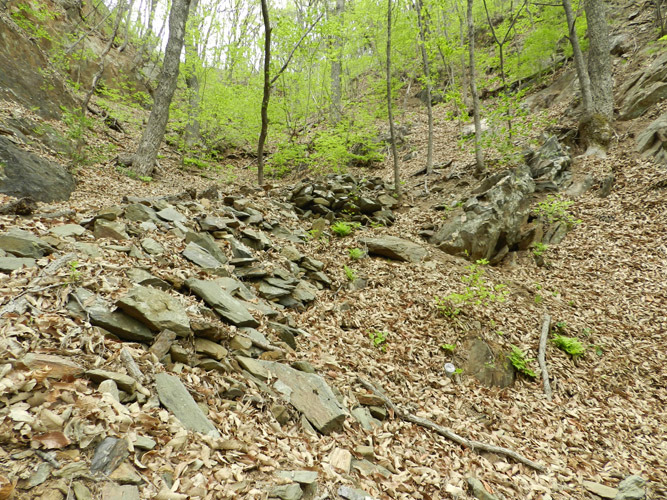 숯고개(탄현)는 고개길도 경사가 급해서 자모리, 갯골쪽은 고개의 폭이 넓어 갈지자로 흙길이 있었을 것 같은데 지금은 무너져 그 흔적만을 볼 수 있고, 오동리 무중골 쪽은 일반고개와 다르게 아래 사진과 같이 인공적으로 돌로 석축을 쌓아 길을 만든 고개이고, 군사들의 숙영을 했을 것 같은 숙영지의 흔적이 있습니다.