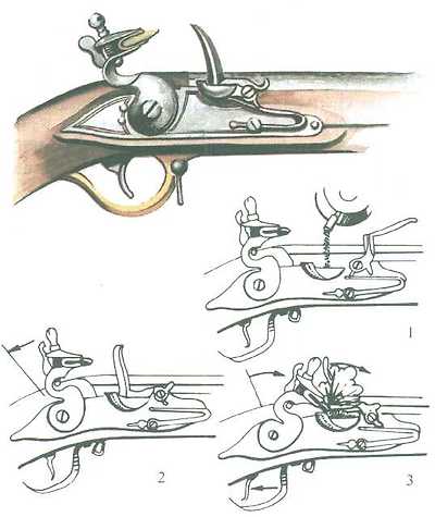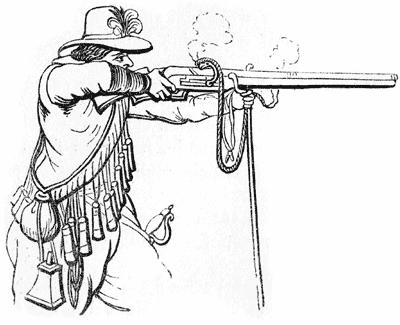 당시의 총은 격발 방식에 따라 주로 세 가지 방식으로 나뉘었습니다. 가장 원시적인 것이 화승총 (matchlock) 이라고 부르는 것이었지요. 화승총은 말 그대로 화승(천천히 타는 심지)를 이용하여 화약에 불을 붙이는 형태였습니다. 화승총은 높은 불발율(20%), 다음 사격까지의 시간이 많이 걸린다는 점, 화승을 계속 적당한 길이로 유지시켜 주어야 한다는 점, 또 야습에 불리하다는 점 (타는 화승의 불빛이 위치를 노출시킴), 주변의 화약에 불이 붙기 쉽다는 점 (따라서 화약 경비병은 이 총을 사용할 수 없었음) 등의 많은 단점이 있었으나, 싸고, 만들기 쉽고, 튼튼하다는 점 때문에 당시의 보병총은 대부분 이 형태였습니다.