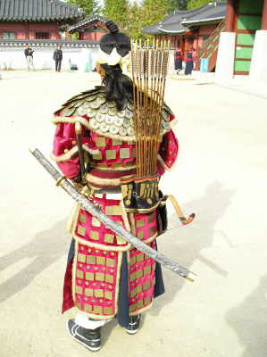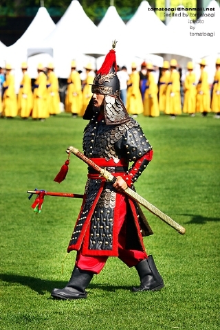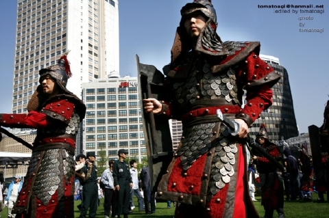 보기에는 분명하게 멋있게 보입니디만.. 고증으로 본다면.. 영.. 아닌 셈입니다. 저 갑옷도 좀.. 신기한게.. 두석린갑이라 하기에도 뭐하고 두장갑이라고 하기에도 뭐한 형태더군요;; 비슷한 갑옷을 제가 서울시에서 경복궁 무슨 행사때 사진과 비교했는데.. 이 갑옷이 조선전기에서도 사용되었는지는 좀 미지수인 것 같습니다.