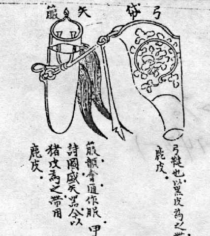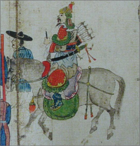 이런 형태를 보입니다. 여기서도 보실수 있듯이.. 칼은 띠돈매기 형태의 동개는 옆드리 뒷쪽으로 착용한 모습을 보여줍니다. 그런데.. 정작 저기 사부들의 경우 동개의 모양 형태도 이상하지만.. 모두 뒷편으로 메고 있다는 사실입니다. 동개의 착용 모습을 당시 기록화나 모습을 보면..