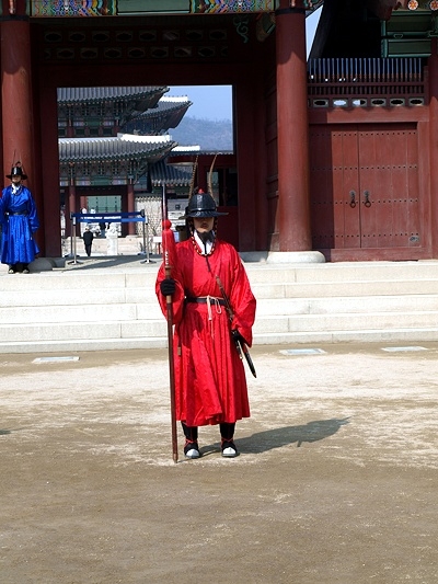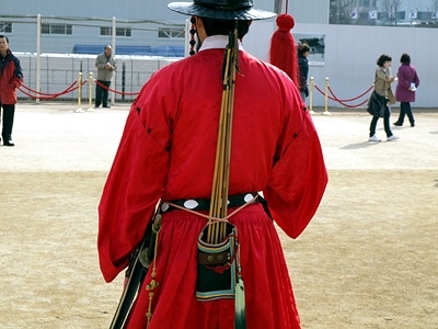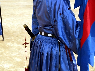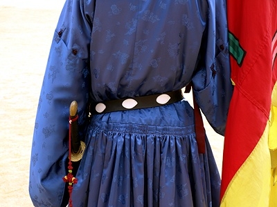 이런 형태가 띠돈매기 형태입니다. 따라서 요대에 묶은 형태의 저 칼찬 형태는 사실상 고증과 전혀 다른 형태를 보여주는 셈입니다. 활과 궁 그리고 칼을 찬 형태는 경복궁에서 갑사의 형태에서 볼수 있습니다만.. 본다면 말이죠.