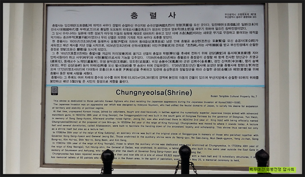 7.21 동아대 석당학술원 학술발표회를 참관하고 동래온천지구에서 잔후 다음날 아침 동래구에 있는 부산충렬사를 찾아서 참배했다.