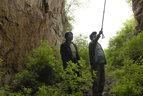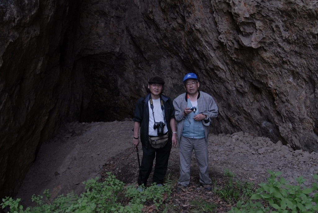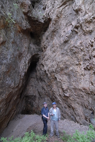 굴입구에서 김일경교수와, 굴입구 양쪽 벽을 보면 사람이 인공적으로 깬 흔적이 많이 보입니다. 사진 뒤에 가운데 시커먼 곳이 제 1굴의 입구입니다. 아마 그곳에는 사다리가 설치되어 있어서 보루성에 올라가기 위해서는 사다리를 타고 올라가서 굴속으로 들어 갔을 거라고 생각합니다.