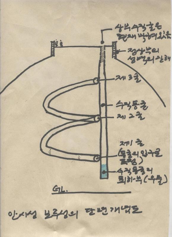 이자료는 2008년 김일경교수와 안시성 답사를 위해 중국으로 갔을때 수집한 자료입니다. 안시성 보루성의 답사는 저에게 아쉬웠지만 기회가 있으면 자일과 장비를 다 준비해서 다시 한번 가 보고싶습니다. 김교수님도 이제 나이가 70세가 넘었습니다. 이제는 답사가자고 제가 부탁드리는 자체가 부담스럽습니다. 제가 생각하기로는 김일경교수님 같은 분은 국가적인 차원에서 우리가 챙겨야할 중요한 인물이라고 생각합니다. 제가 공사방법에 대해 생각해 봤습니다. 김교수님은 중국 조선족 신문에 주필까지 하셨던 분으로 알고 있습니다. 이제 거두절미하고, 아마 이랬을 겁니다.이제 건축구조에 대해서 이야기 좀 해봐야 할것 같습니다. 우선 맨위 보루성에서 부터 사람이 굴 내부에서 걸어다닐 수 있는 경사로 바위속을 나선형으로 파내려 갔을 겁니다. 굴창이 세개가 났으니 최소한 나선형이 세바퀴 이상 돌았다는 것입니다. 내부굴이 완성된후 그다음 단계로 외부에서 바위를 깨서 내부굴과 만날때까지 파 들어갔을거라고 생각합니다. 산정상부가 보루성이라서 물을 확보하기위해 굴의 최하부에 물이 모일수 있는 연못을 만들었을 거라고 생각합니다. 우리를 안내해준 중국여인 전언에 의하면 얼마전 어떤 사람이 굴속 연못에 빠져 익사했다고 했습니다. 우리는 굴에 들어가기위해 여러번 접근을 시도했으나 실패했습니다. 로프가 없이는 접근이 불가능했습니다. 제가 굴의 개념도를 그릴 수 있었던 것은 굴내부를 조사한 김일경교수의 설명을 듣고 그린 것입니다. 다음에 로프나 사다리를 준비해서 다시 답사해볼 작정입니다. 그리고 산정상 그러니까 보루성에서 아래로 내려가는 굴입구는 일제시대 만주의 일본군이 메웠다고 합니다. 일본군도 고구려군과 마찬가지로 전방초소로 사용했을 수도 있었겠다는 생각이 듭니다. 김일경교수의 전언에의하면 나선형으로 돌아가는 굴은 사람이 바로 서서 걸을 수 있는 높이라고 합니다. 산정상부에는 지금도 성돌이 많이 쌓여 있었습니다. 그러니까 이성은 성벽에 성문이 없고 바위 아래 뚫어놓은 제 1굴이 성안에 들어가는 유일한 수단입니다. 그것도 제1굴로 들어가기 위해서는 사다리나 로프가 없이는 불가능합니다. 이런 구조를 보통 현문구조라고 하지만 이는 보통 현문구조와는 또 다른구조라, 무엇이라고 불러야 할지 고민입니다. 이곳은 안시성과는 달리 중국사람들도 잘 몰라 감시원이 없습니다. 우리가 갔을때도 보루성 입구의 마을에 중국 공안의 순찰차가 있었습니다만 아무런 저지도 받지 않았습니다. 그리고 마을 사람들만 이성을 고려성이라고 했습니다. 보루성에서 보면 안시성의 주봉인 안시성 장대가 보입니다. 수, 당, 군사가 쳐들어 오는 길목에 설치된 보루성이라 당시 봉화를 이용하여 안시성에 연락을 하지 않았나 추정됩니다. 세개의 굴입구는 보루성으로 올라가는 입구역활도 했겠지만 채광과 환기를 위한 光窓 역활도 했을것이라고 추정됩니다.