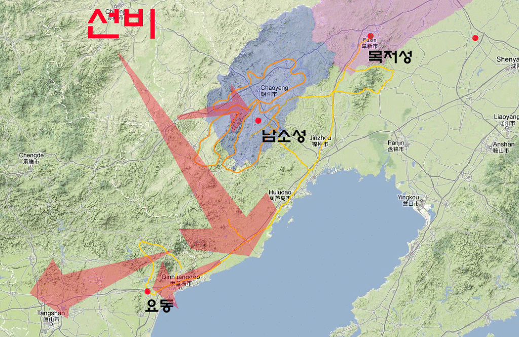 위의 그림처럼 선비가 남쪽으로 그냥 남하했다면 바로 남소성 지역과 맞닿는다. 고구려와 충돌이 발생할 수 있고, 고구려와 적절한 외교관계도 맺었을 수도 있다. 동맹관계라도 맺었다면 전력을 다해 서쪽으로 요동지역과 북경지역으로 진격이 가능해진다. 이 내용들은 그냥 상식적으로 생각한 것이다.
